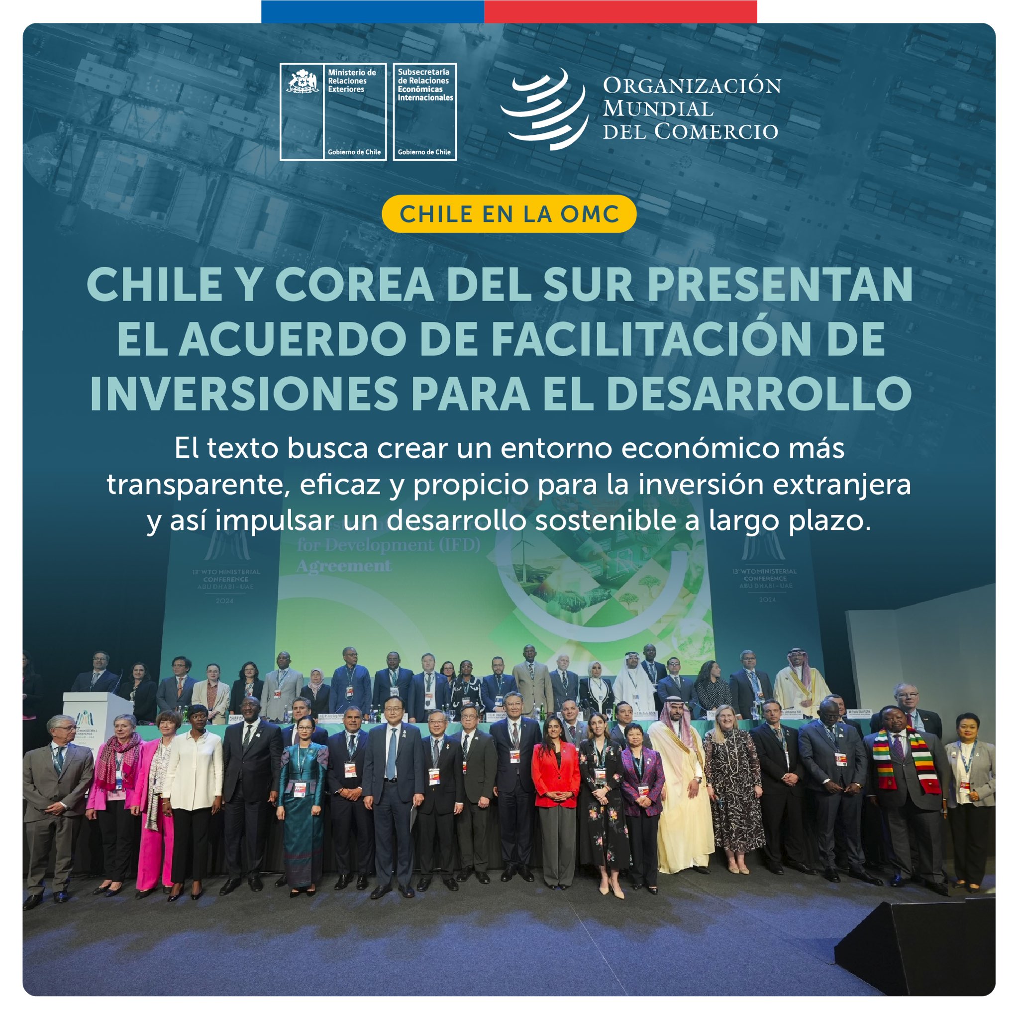 Asimismo, la subsecretaria y su delegación participaron en las diversas reuniones relacionadas a la Conferencia Ministerial (CM13) de la Organización Mundial del Comercio, incluida la finalización del texto del Acuerdo de Facilitación de Inversiones para el Desarrollo (AFID), cuya negociación fue coordinada por Chile y Corea del Sur, y que fue adoptado por más del 75% de los miembros.