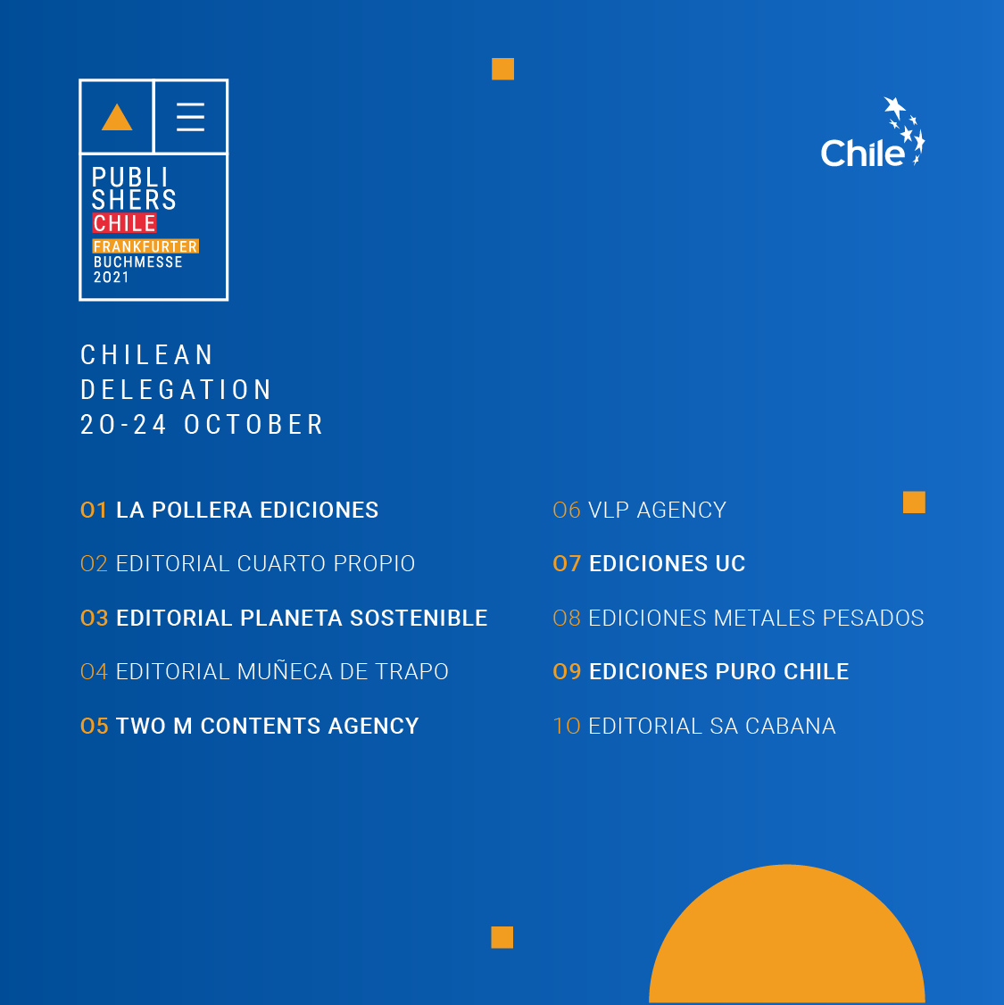 Las 10 editoriales chilenas han llegado a la Feria del Libro de Frankfurt, a la luz de la coordinación entre el Ministerio de las Culturas, las Artes y el Patrimonio, a través del Consejo Nacional del Libro y la Lectura y el Ministerio de Relaciones Exteriores a través de ProChile. En total, participan físicamente 1.500 expositores de más de 70 países, en Fráncfort, con Canadá como invitado de honor. Cuando la feria concluya, los canadienses pasarán el testigo a España, país invitado de la edición del 2022.