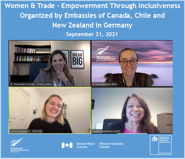 Hoy, como parte de las actividades para difundir el Arreglo Global de Género y Comercio (GTAGA, por su sigla en inglés), las embajadas en Alemania de Chile, Nueva Zelandia y Canadá con el apoyo del Departamento de Comercio Inclusivo de SUBREI, organizaron el Webinar "Mujer y Comercio: Empoderamiento a través de la inclusión", que contó con representantes de los tres países.