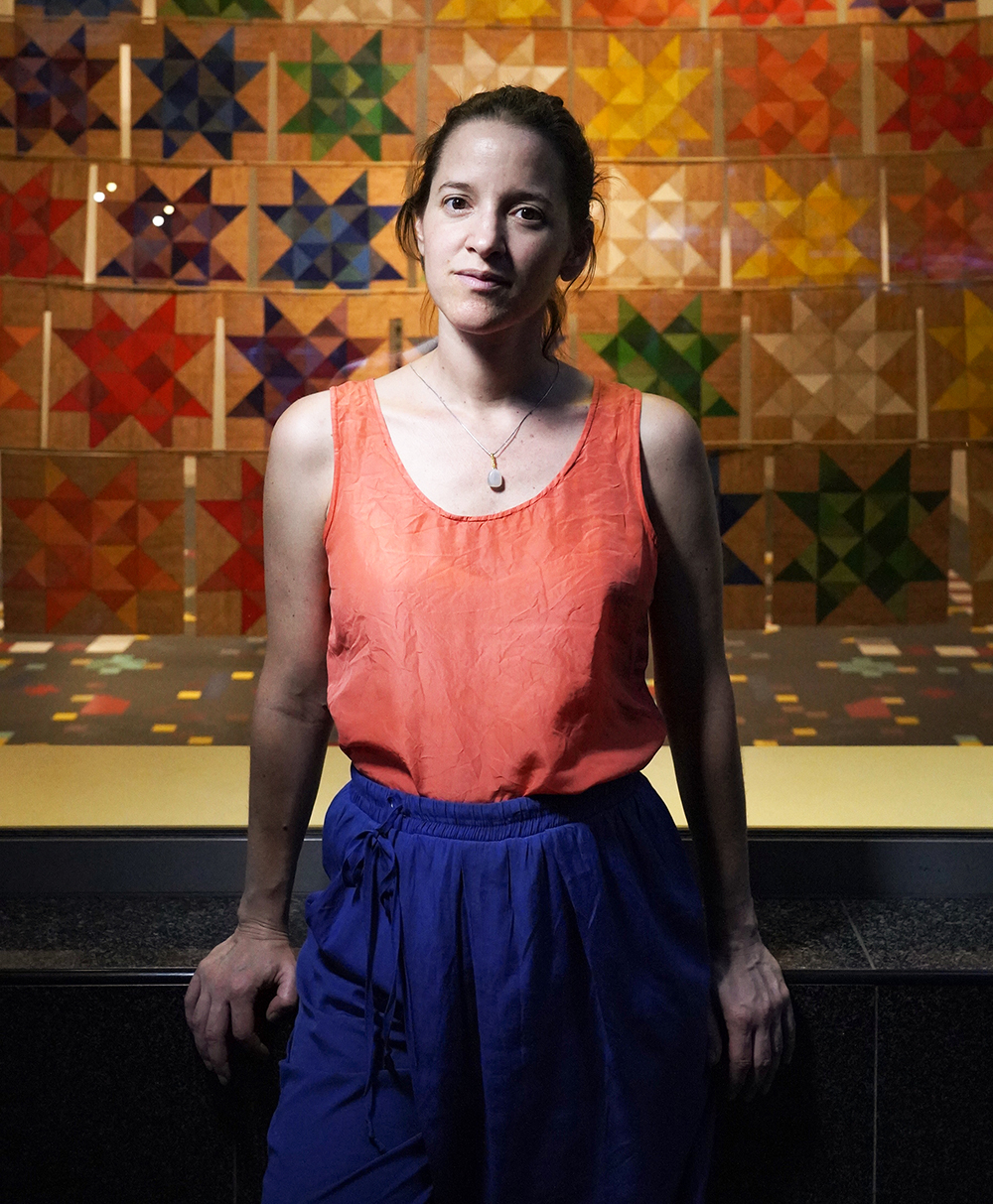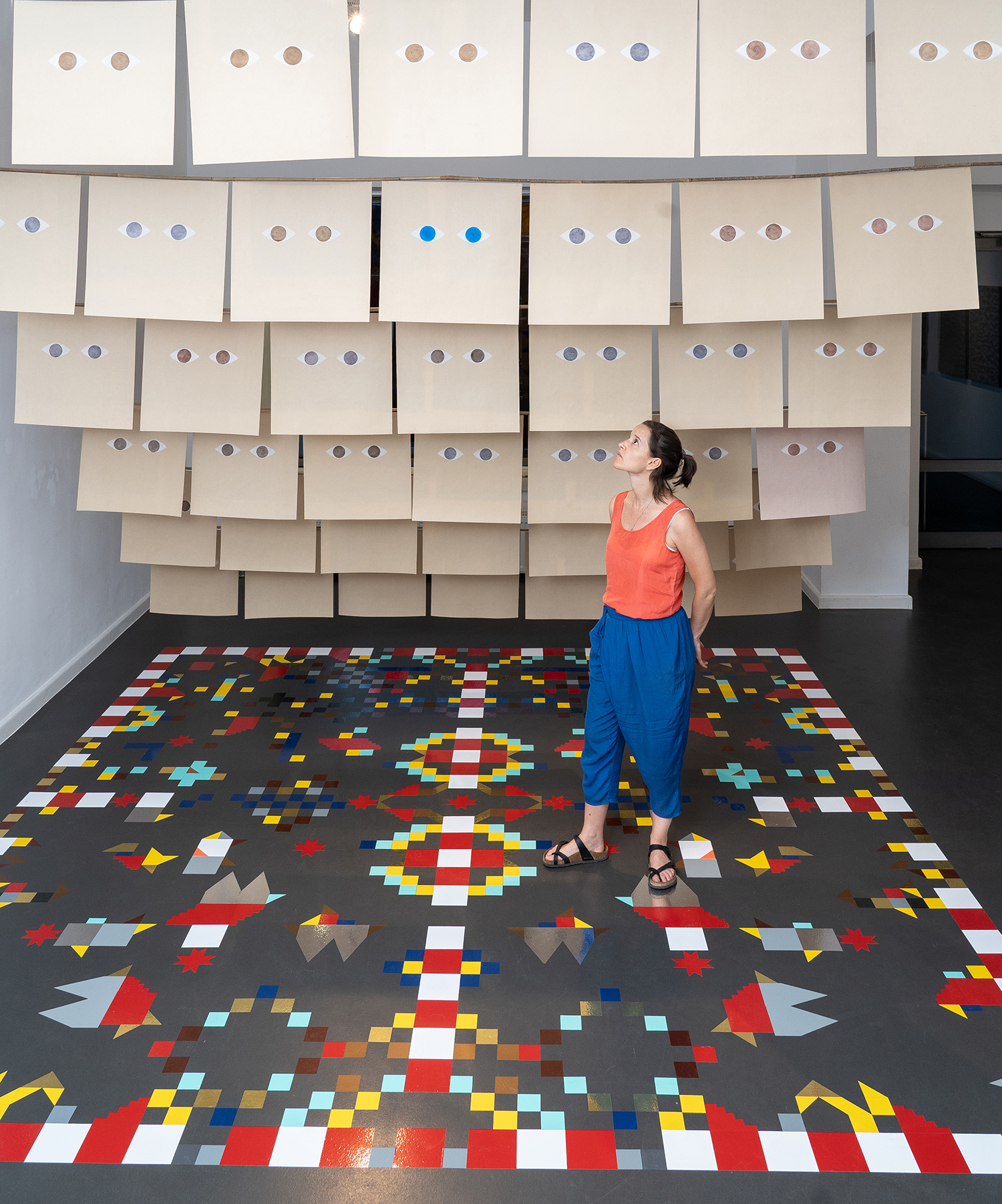 En el suelo del espacio se improvisa una alfombra con motivos geométricos recurrentes en telares andinos. Ésta recibe a la Wiphala para contenerla, enaltecerla y acogerla en este nuevo lugar, generando un cruce entre lo que encontramos arriba y abajo y conectándonos de manera natural con el cielo y con la tierra.