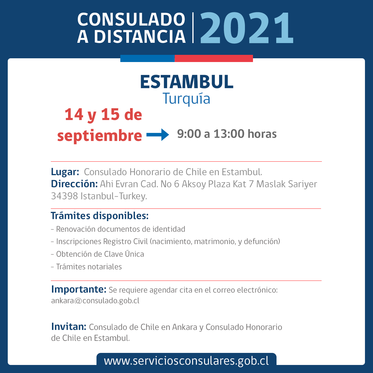 Los días 14 y 15 de septiembre, el Consulado de Chile en Ankara realizará un consulado a distancia en Estambul.