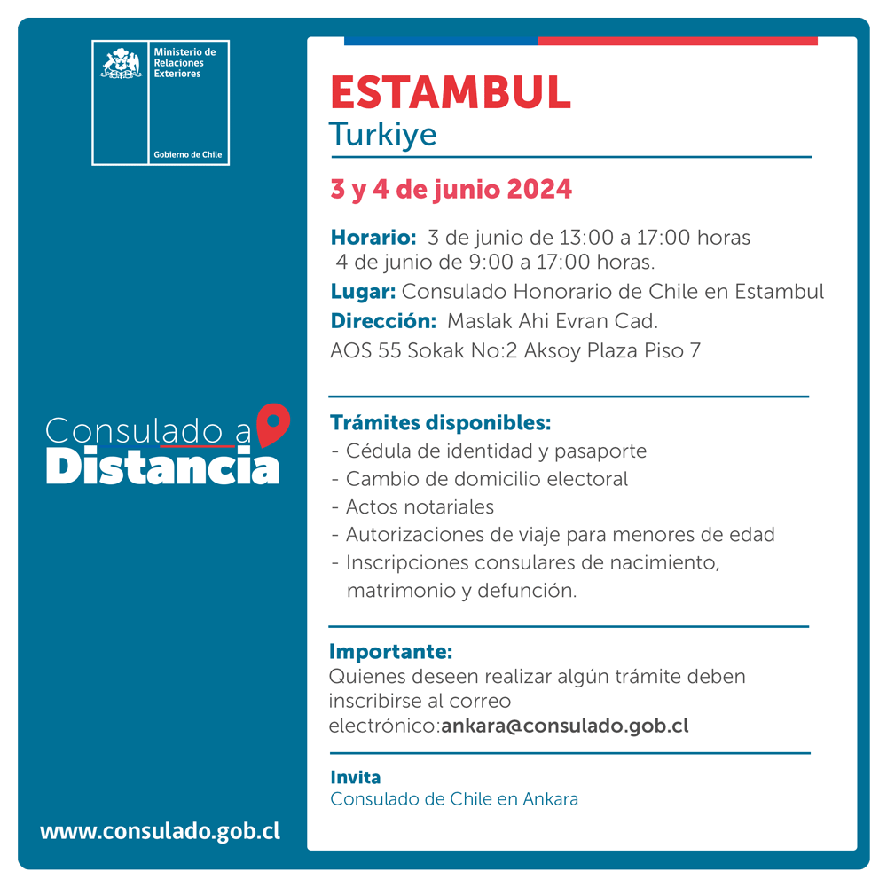 El Consulado de Chile en Ankara se trasladará a Estambul, los días 3 y 4 de junio del año 2024, para realizar atenciones a chilenas y chilenos residentes.