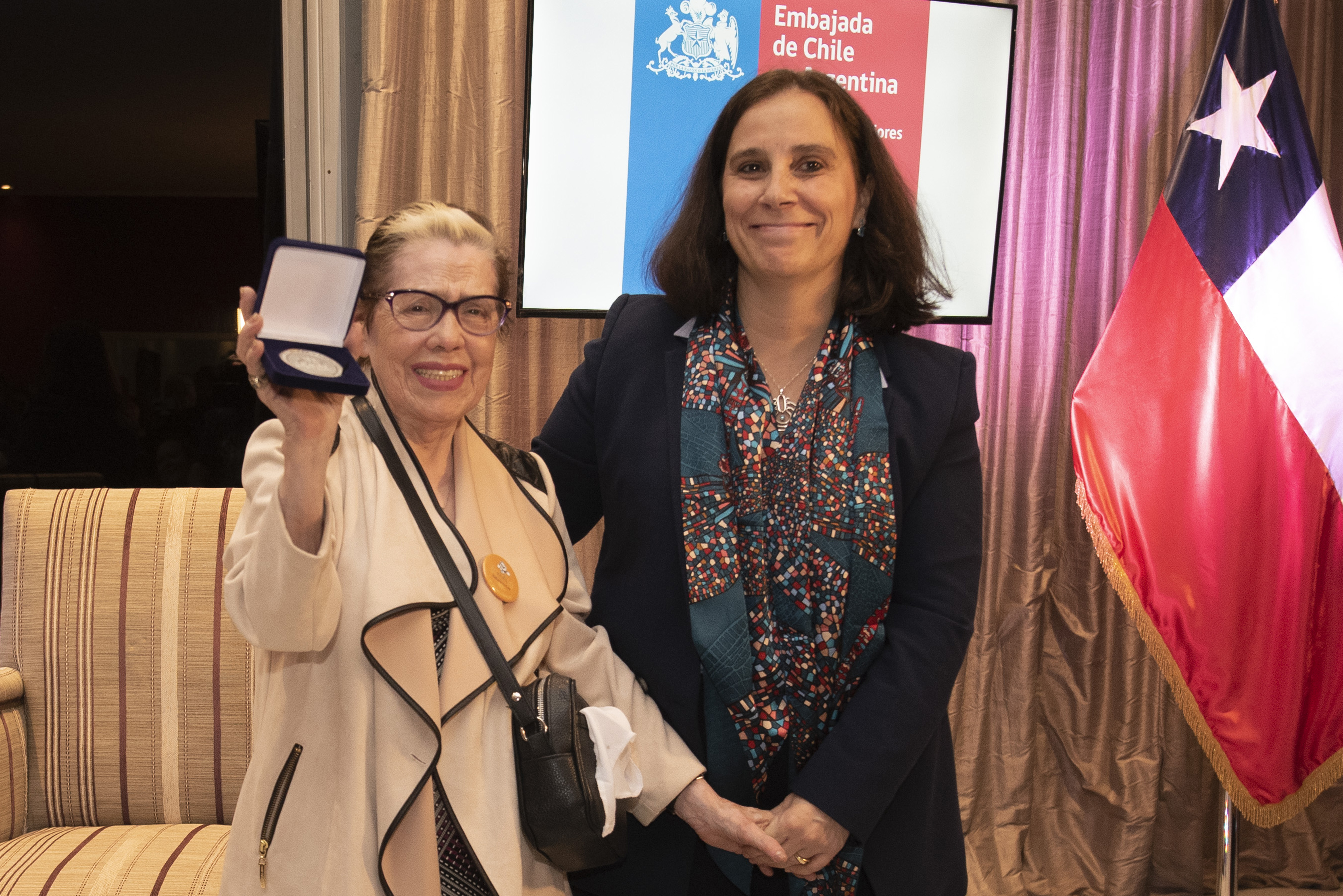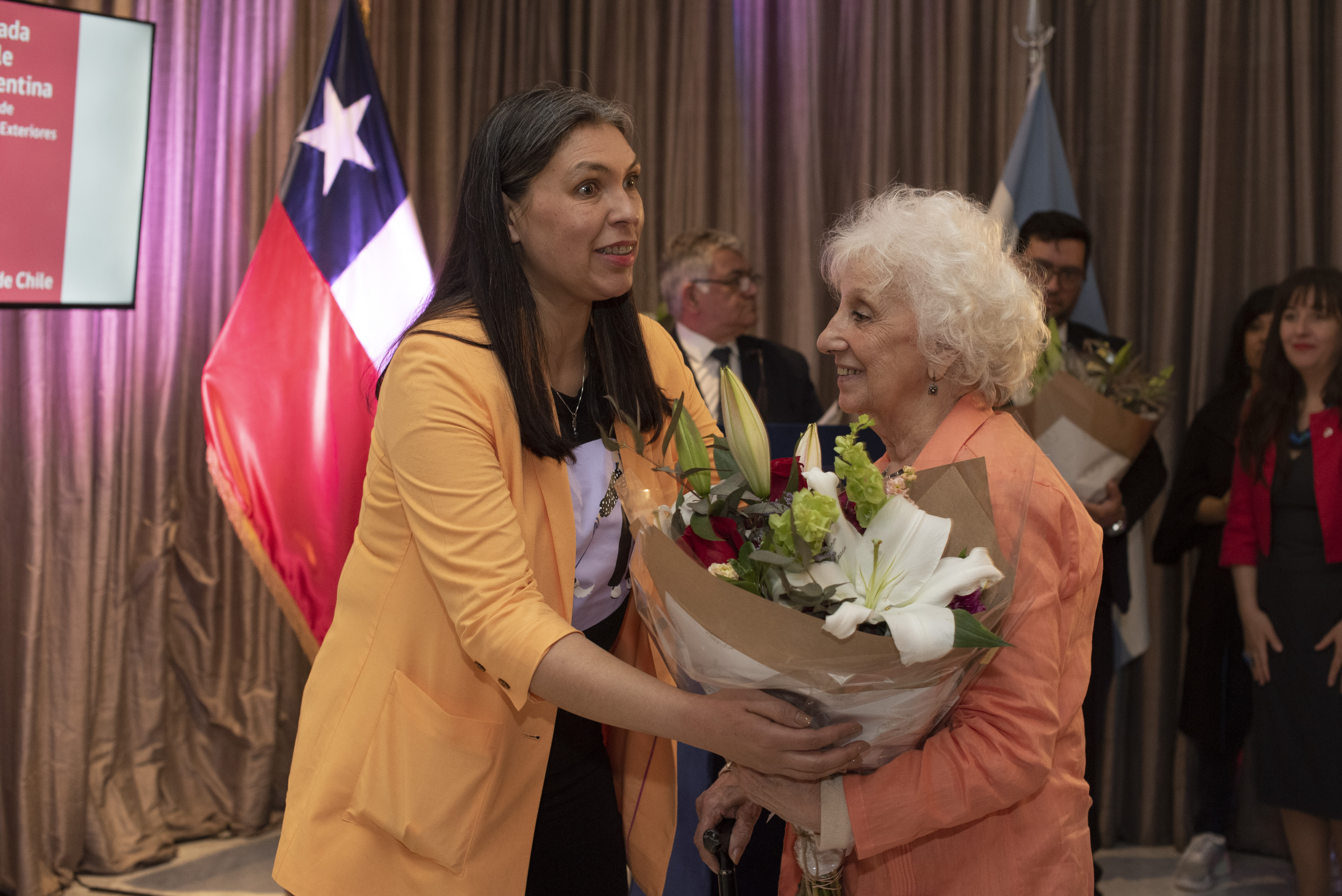 Posteriormente se le entregó de manos de la Canciller Antonia Urrejola, un reconocimiento a nuestra querida Buscarita Roa. Transmitiendo con ello a todas y todos quienes componen la Asociación Abuelas de la Plaza de Mayo, nuestro agradecimiento y admiración por la defensa de los Derechos Humanos. En tanto, nuestra Embajadora Bárbara Figueroa destacó la labor y la continua fortaleza humana que siempre ha acompañado a madres y abuelas de plaza de mayo, siendo ellas testimonios vivientes de la memoria histórica, y que evocan el Nunca Más.