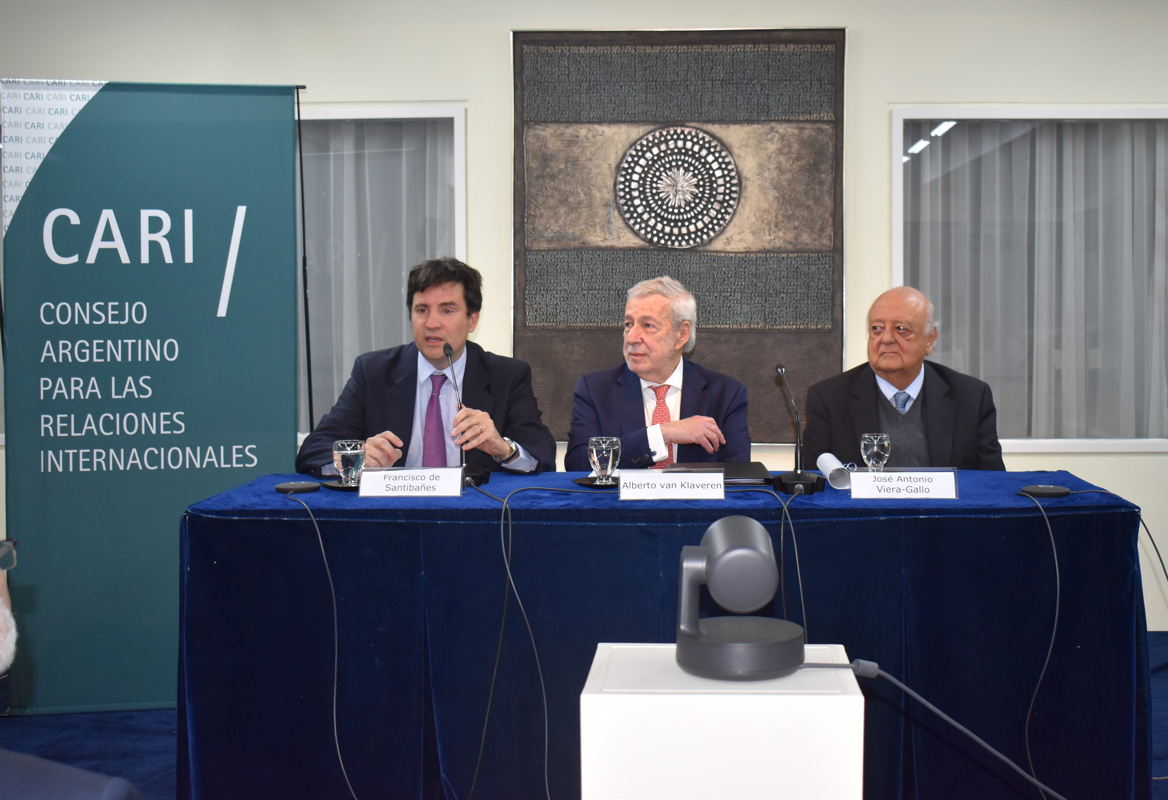 El ministro de Relaciones Exteriores Alberto van Klaveren, dio una disertación académica sobre Política Exterior de Chile, "Entre la continuidad y el Cambio", en la sede del consejo Argentino para las Relaciones Internacionales CARI, contando con la asistencia de embajadores, catedráticos, diplomáticos, estudiantes universitarios de la UBA y del ISEN, entre otros invitados.