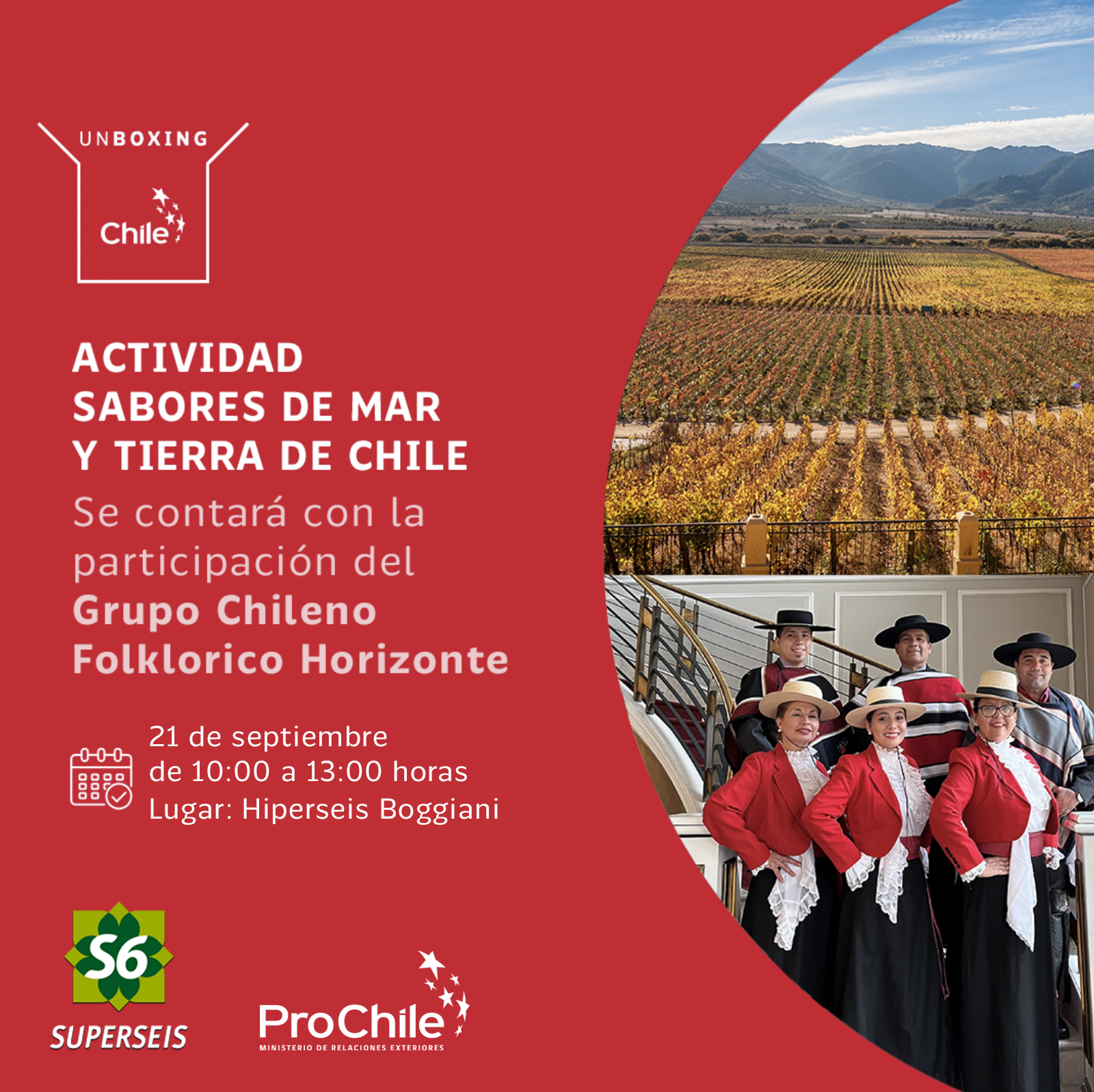 ¡Atención, comunidad chilena en Paraguay! Los invitamos a celebrar nuestras fiestas patrias con un evento lleno de tradición y sabor: "Sabores de Mar y Tierra ", donde podrán disfrutar de un show de cocina en vivo, degustar lo mejor de nuestros productos chilenos y vivir nuestra cultura con los bailes típicos presentados por el Conjunto Folklórico Horizonte.