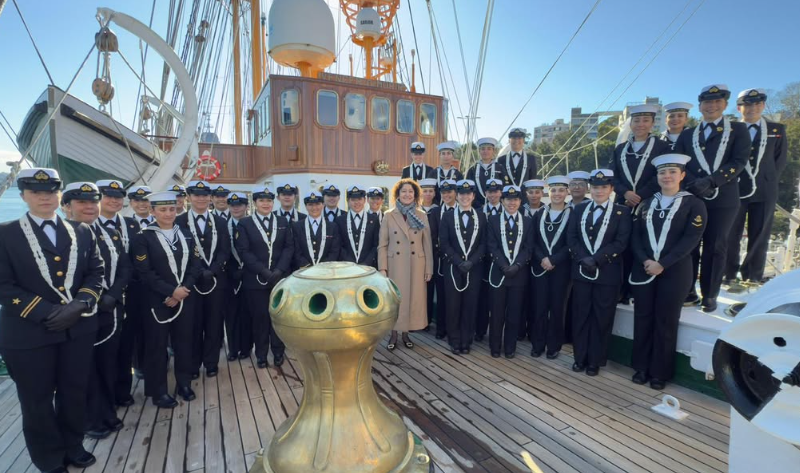 La embajadora de Chile en Australia, Beatriz de la Fuente —primera mujer en ocupar este cargo en el país—, compartió además un emotivo momento con las 39 mujeres que hoy integran la dotación del 69° Crucero de Instrucción.