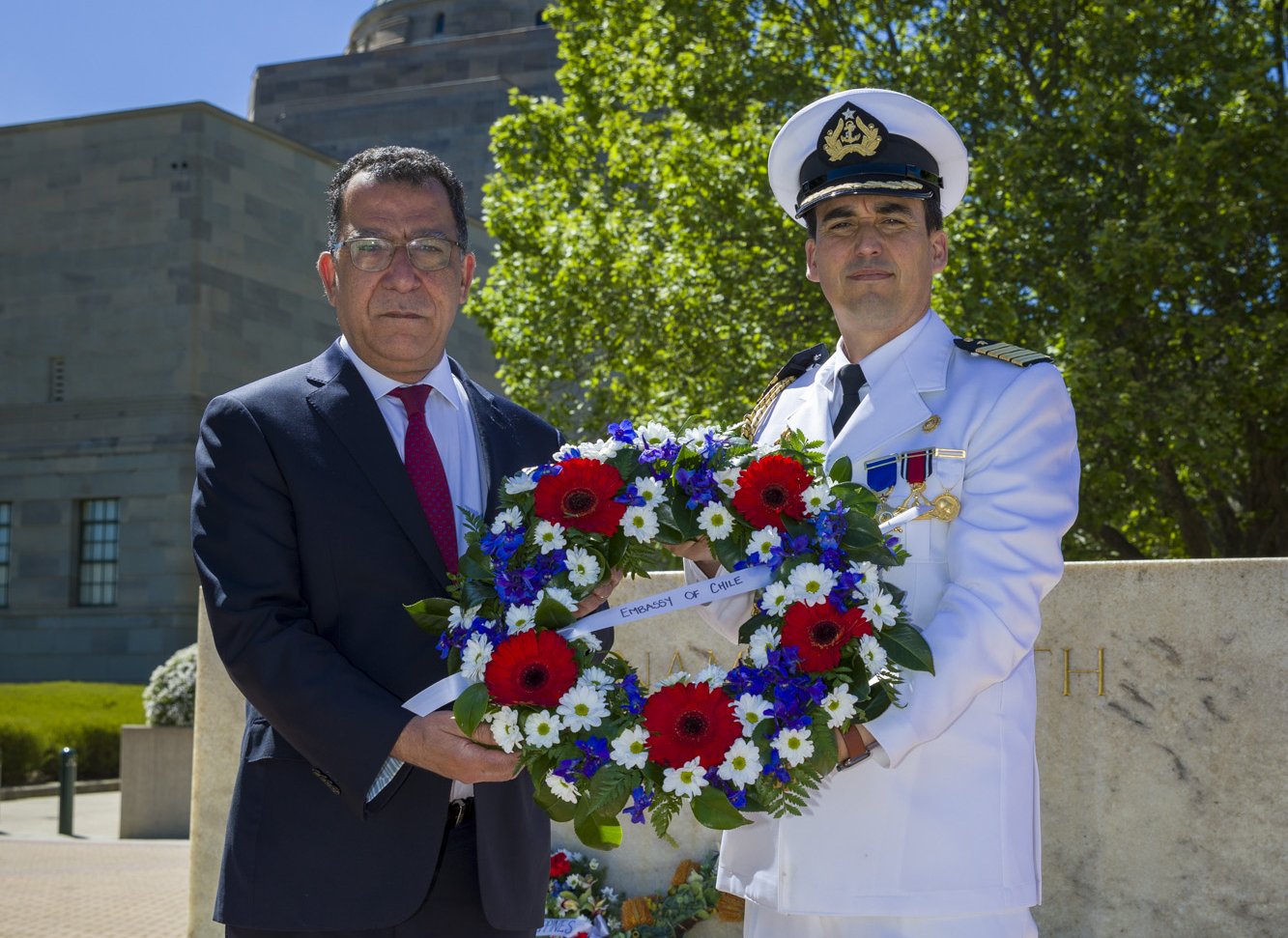 El Embajador de Chile en Australia, Jaime Chomali, junto al Agregado de Defensa, CN Julián Maldonado, presentaron una ofrenda floral en el War Memorial de Canberra, en conmemoración de los caídos durante conflictos armados en los que ha participado Australia, en marco del Remembrance Day.