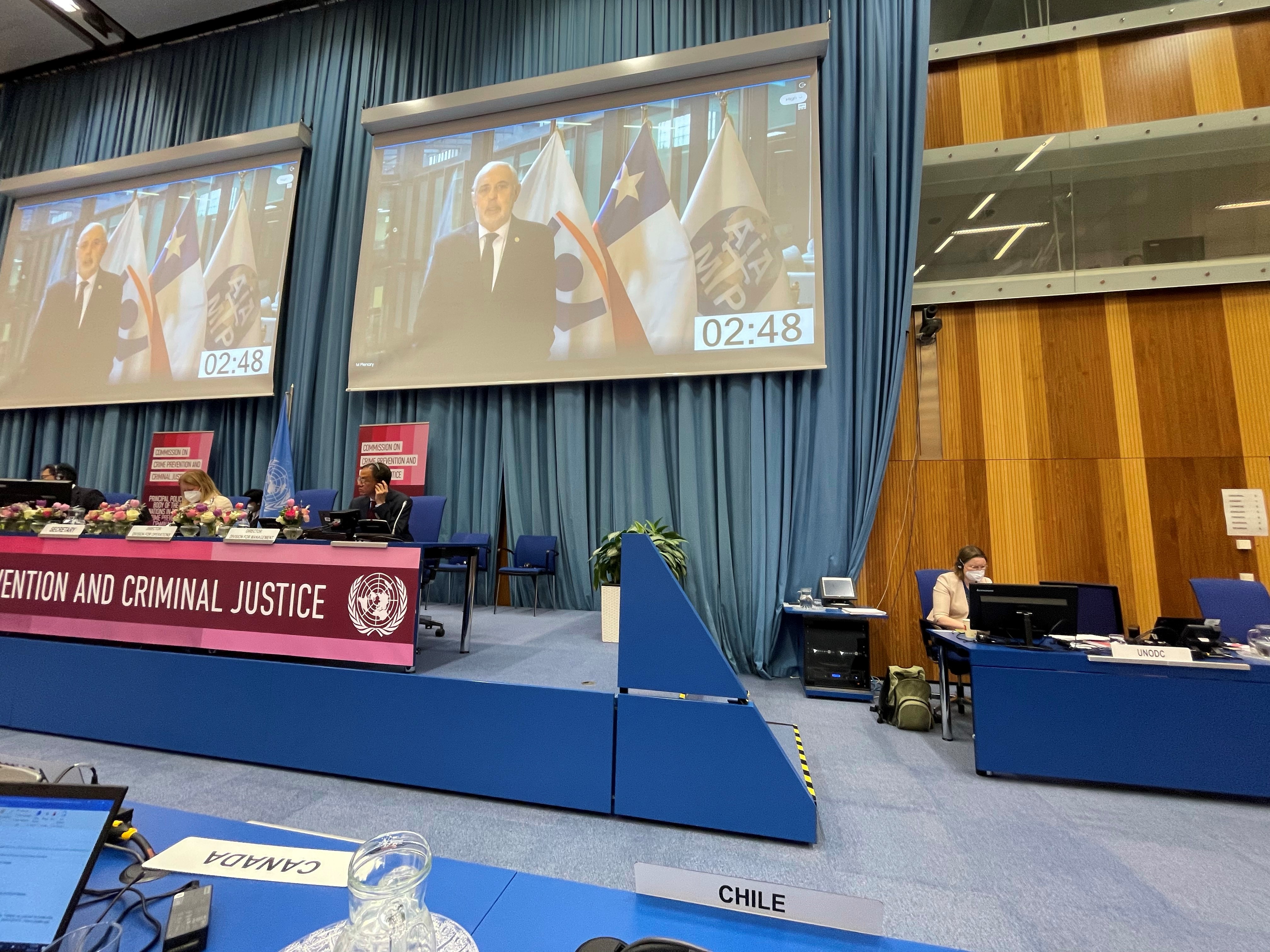 Nuestro país estuvo representado virtualmente por el Fiscal Nacional, Sr. Jorge Abbott, y presencialmente en Viena por la Representante Permanente de Chile, Embajadora Belén Sapag y diplomático/as del Servicio Exterior, Mila Francisco y Jorge Torres.
