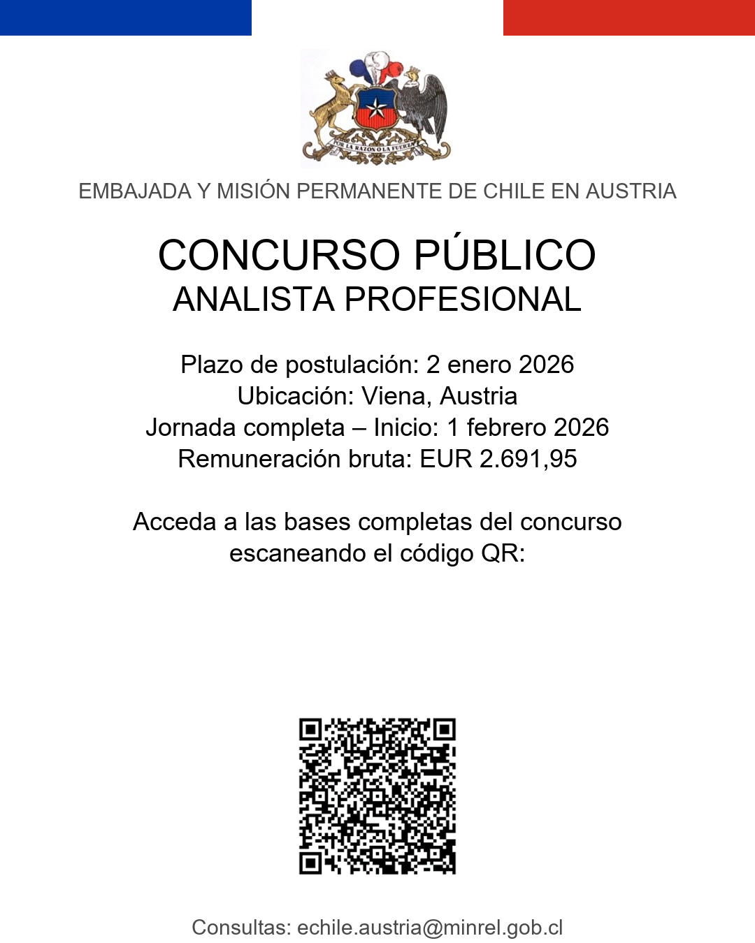 La Embajada y Misión Permanente de Chile en Austria invita a profesionales interesados/as a participar en el proceso de selección para el cargo de analista profesional. Se busca a una persona con elevada capacidad analítica, sólida formación profesional y habilidades lingüísticas avanzadas, comprometida con los valores del servicio público.