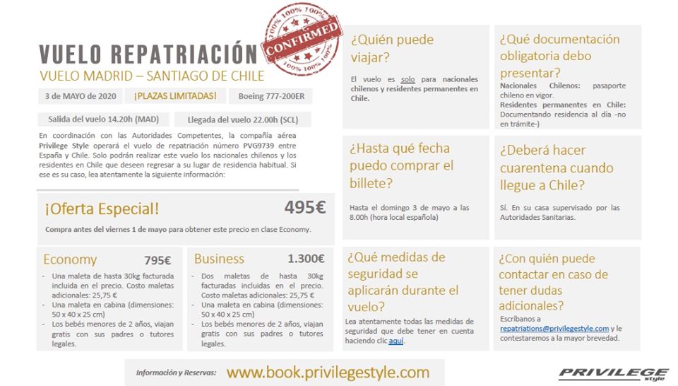 Informamos a nuestros connacionales y extranjeros residentes en Chile que, el próximo domingo 3 de mayo, habrá un vuelo entre Madrid y Santiago organizado por la aerolínea chárter Privilege. El avión partirá a las 14:20 hrs. desde el terminal 4 (T4) del aeropuerto de Barajas.