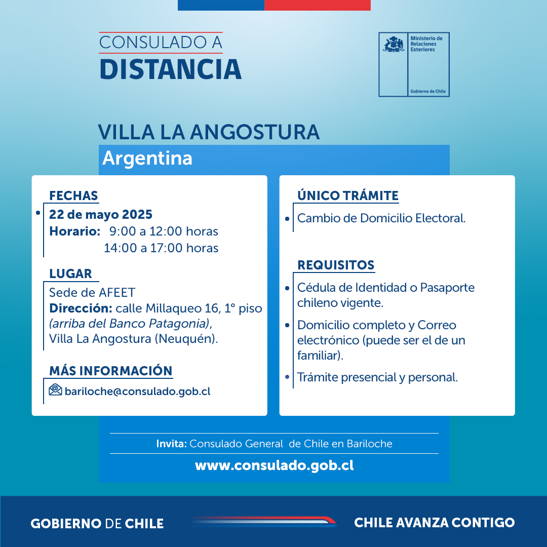 Este Consulado comunica que, teniendo presente que este año habrá elecciones presidenciales en Chile, el jueves 22 de mayo, el Cónsul General de Chile en S.C. de Bariloche, atenderá en Villa La Angostura.
