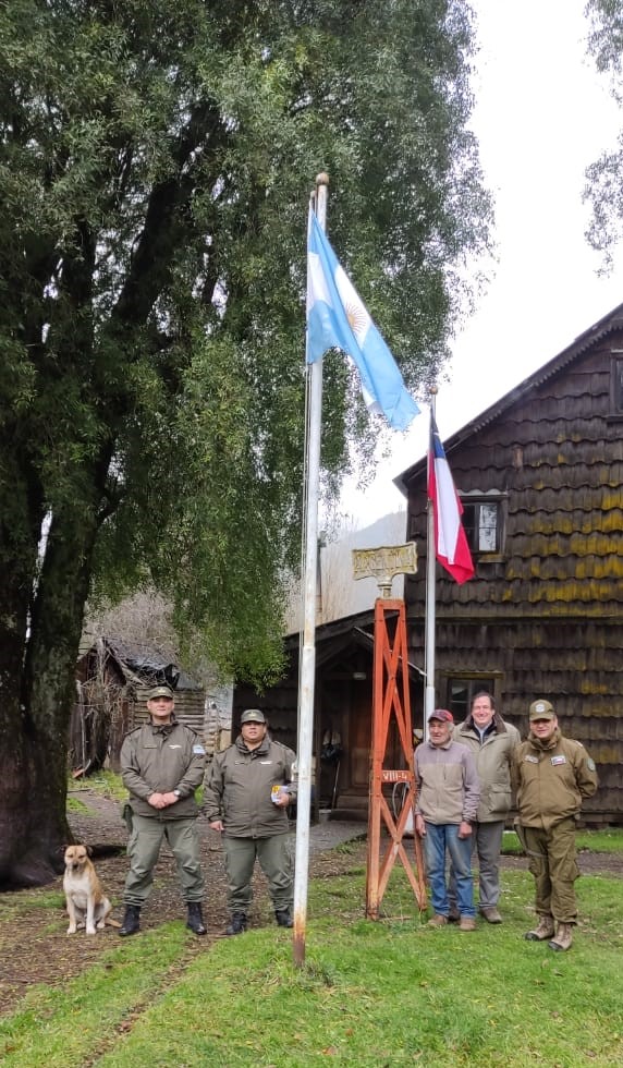 Asimismo, tuvo oportunidad de entregar nuevas banderas (chilena y argentina) a la familia Bahamondes, cuya vivienda está en el hito, lo que aprecia en las fotografías.