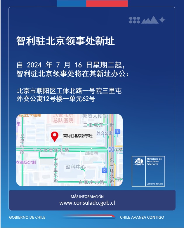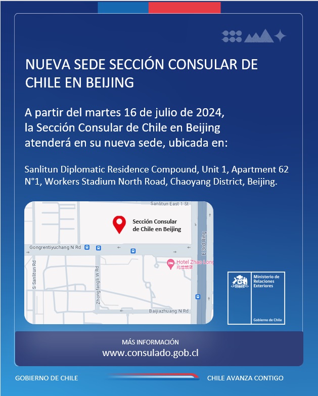 A partir del miércoles 16 de julio de 2024, la Sección Consular de Chile en Beijing atenderá en su nueva sede, ubicada en: