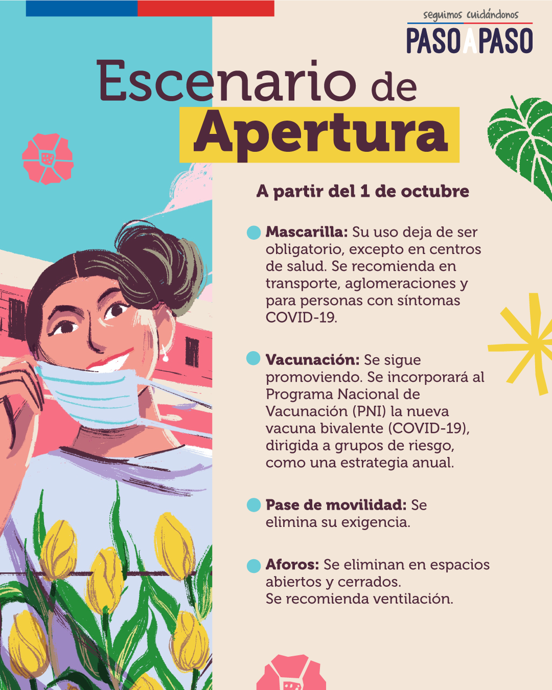 El Ministerio de Salud informó que, debido al nuevo momento epidemiológico y las exitosas coberturas de inoculación, Chile entrará al Escenario de Apertura dentro del Plan Seguimos Cuidándonos, donde entre otras cosas, se descontinuará la exigencia del pase de movilidad.