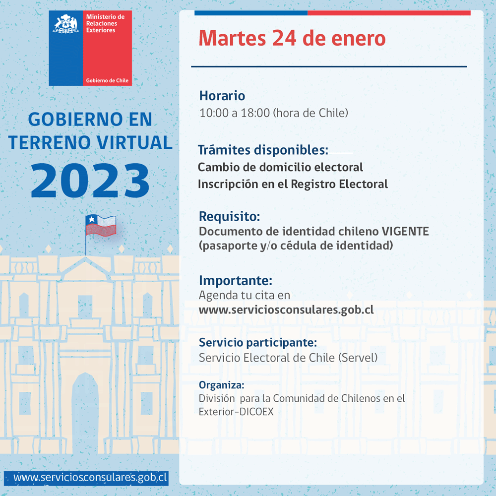 Con el objeto de facilitar a los connacionales que residen en el exterior la posibilidad de realizar trámites electorales, la División para la Comunidad de Chilenos en el Exterior (Dicoex) desarrollará un nuevo Gobierno en Terreno Virtual, donde funcionarios de la Unidad Internacional del Servicio Electoral de Chile- SERVEL atenderán, de forma telemática, solicitudes de cambio de domicilio electoral e incorporación al Registro Electoral.