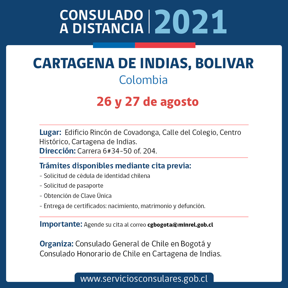 Los días 26 y 27 de agosto, el Consulado General de Chile en Bogotá, Colombia, realizará un consulado a distancia en Cartagena de Indias, Bolívar.