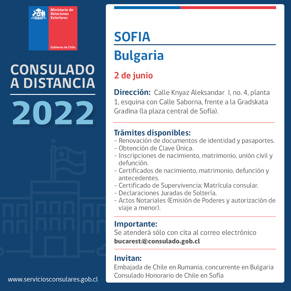 El día 2 de junio, el Consulado de Chile en Bucarest, realizará un consulado a distancia en la ciudad de Sofía, Bulgaria.