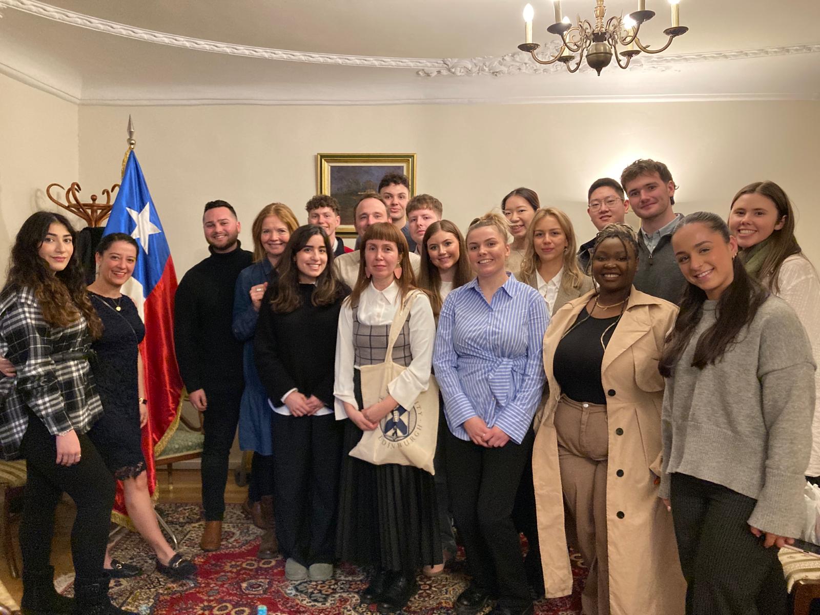 El pasado mes de febrero, recibimos la visita de 16 estudiantes de economía y negocios, provenientes desde Edimburgo, Escocia, interesados/as en conocer la labor e importancia de un consulado para las relaciones comerciales y culturales entre países.