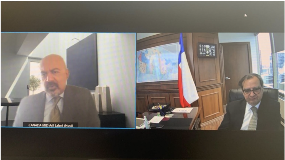 El Embajador de Chile en Canadá, Raúl Fernández Daza, sostuvo una audiencia con el Director General para Organizaciones Internacionales del Ministerio de Relaciones Exteriores de Canadá, Arif Z. Lalani. En la reunión, conversaron sobre los difíciles momentos que está viviendo actualmente el sistema internacional y el multilateralismo en particular.