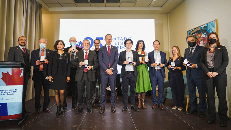 Durante la ceremonia además se entregaron medallas conmemorativas de los 25 años del acuerdo, y empresas chilenas y canadienses dieron sus testimonios sobre su experiencia con el uso de este tratado.