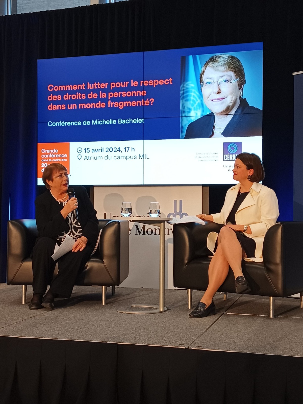 Con motivo del vigésimo aniversario del Centro de Estudios Internacionales de la Universidad de Montreal, CERIUM, la ex Presidenta Michelle Bachelet impartió una clase magistral ante autoridades académicas, alumnos, diplomáticos y comunidad chilena residente en esa ciudad. Su charla fue una invitación al diálogo y la reflexión sobre los desafíos actuales para la paz y seguridad internacionales y la defensa de los derechos humanos en un mundo fragmentado.