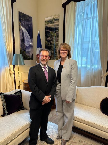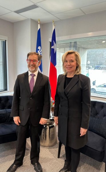 En su primera visita oficial a la ciudad de Quebec, el embajador Juan Carlos García fue recibido por altas autoridades de la provincia, entre ellas: la vicegobernadora de Quebec, Manon Jeannotte (fotografía de la izquierda), la presidenta de la asamblea Nacional de Quebec, Diputada Nathalie Roy (fotografía del centro), la ministra de Relaciones Internacionales de Quebec, Martine Biron (fotografía de la izquierda), con el viceministro de Minas de Quebec, Ian Morrisette, y el alcalde de la ciudad de Quebec, Bruno Marchand. Estas y otras reuniones del programa de actividades, permitieron resaltar la excelente relación que tiene Chile con la nación quebequense, las iniciativas de colaboración y proyectos de cooperación a futuro.