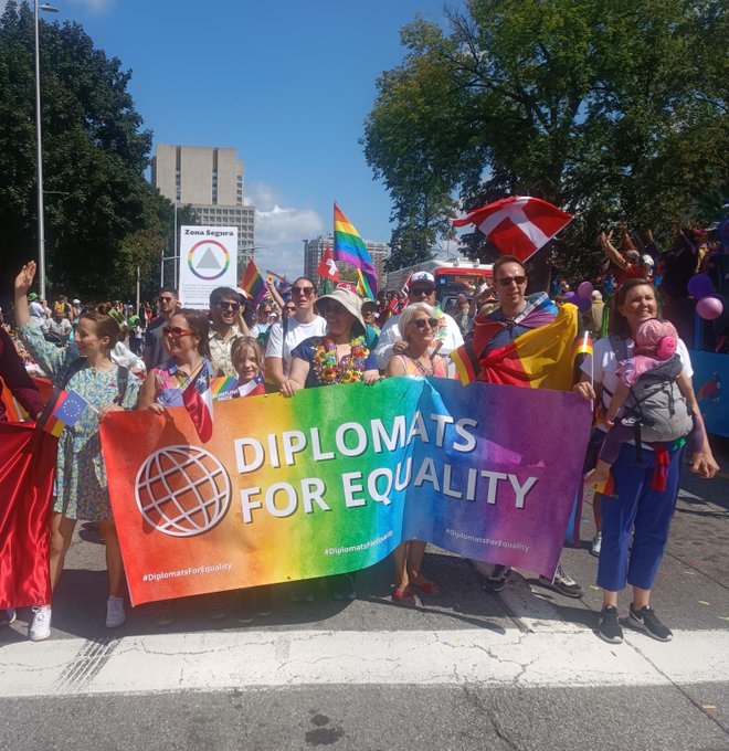 La ENAI Andrea Droppelmann participó en representación de Chile en el Pride Parade 2023 el domingo 27 de agosto, junto a los jefes de misión del grupo "Diplomáticos por la Igualdad", que convoca a las misiones de países que integran de Equal Rights Coalition (ERC), liderados este año por Alemania y México. Con motivo de este evento, Chile suscribió la declaración que se circuló en redes sociales y sitio oficial de ERC.