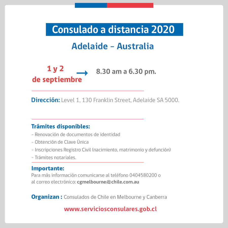 Los días martes 1 y miércoles 2 de septiembre se atenderá a chilenos residentes en la ciudad de Adelaide, Australia. La actividad "Consulado a distancia" es organizada por los Consulados de Chile en Melbourne y Canberra.