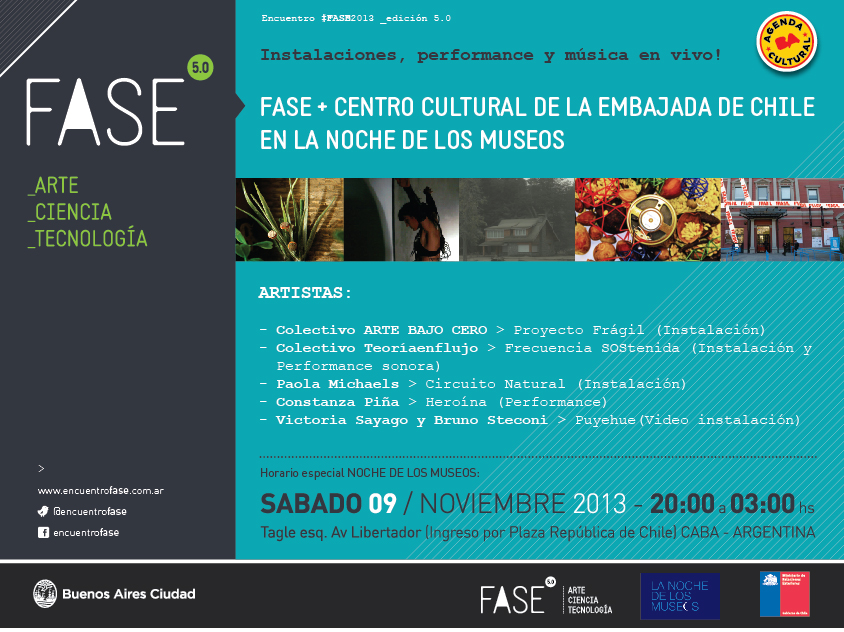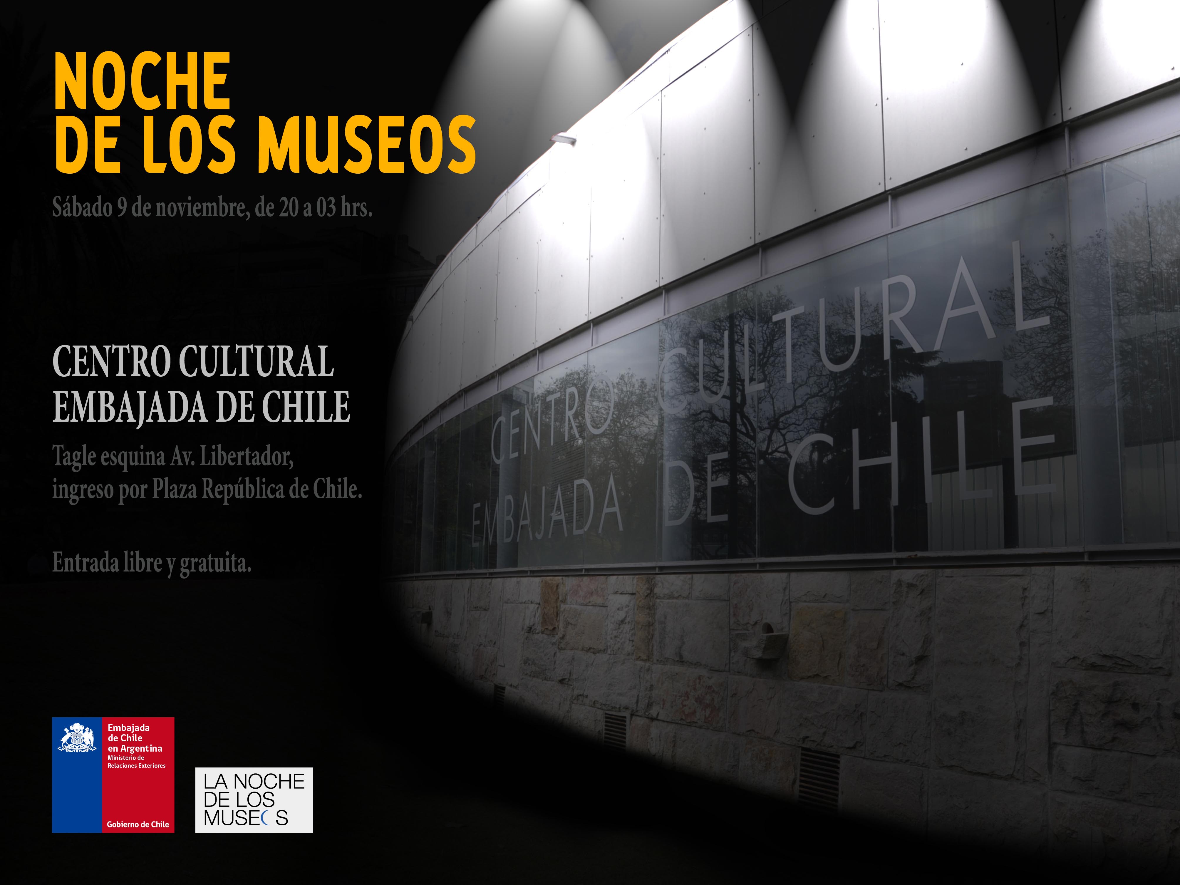 El próximo sábado 9 de noviembre el Centro Cultural de la Embajada de Chile en Argentina, se sumará a la próxima edición de La Noche de los Museos, organizada por el Ministerio de Cultura del Gobierno de la Ciudad de Buenos Aires, la actividad se realizará entre las 20 hrs. y las 3 de la madrugada y contará con música en vivo, instalaciones y performances.