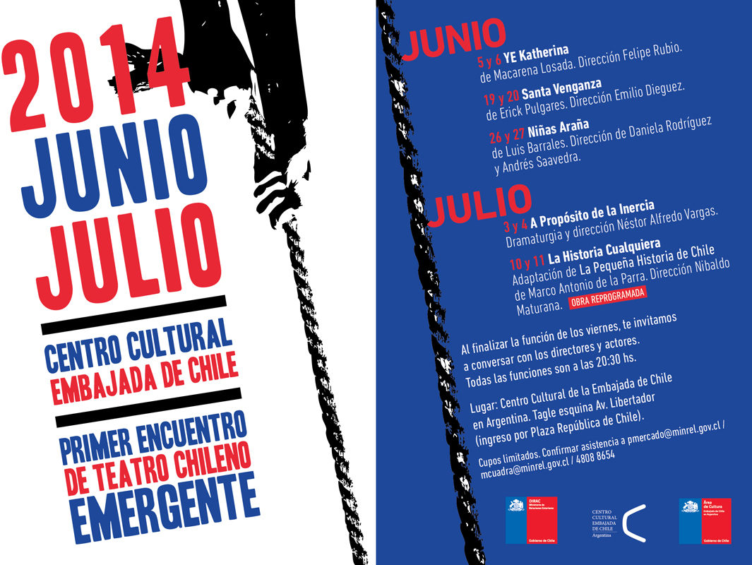 La Embajada de Chile en Argentina, a través de su Departamento de Cultura, presenta el Primer Encuentro de Teatro Chileno Emergente, que se realizará en Buenos Aires a partir del 5 de Junio y hasta el 11 de julio de 2014, en el ámbito de su Centro Cultural, con entrada LIBRE y GRATUITA.