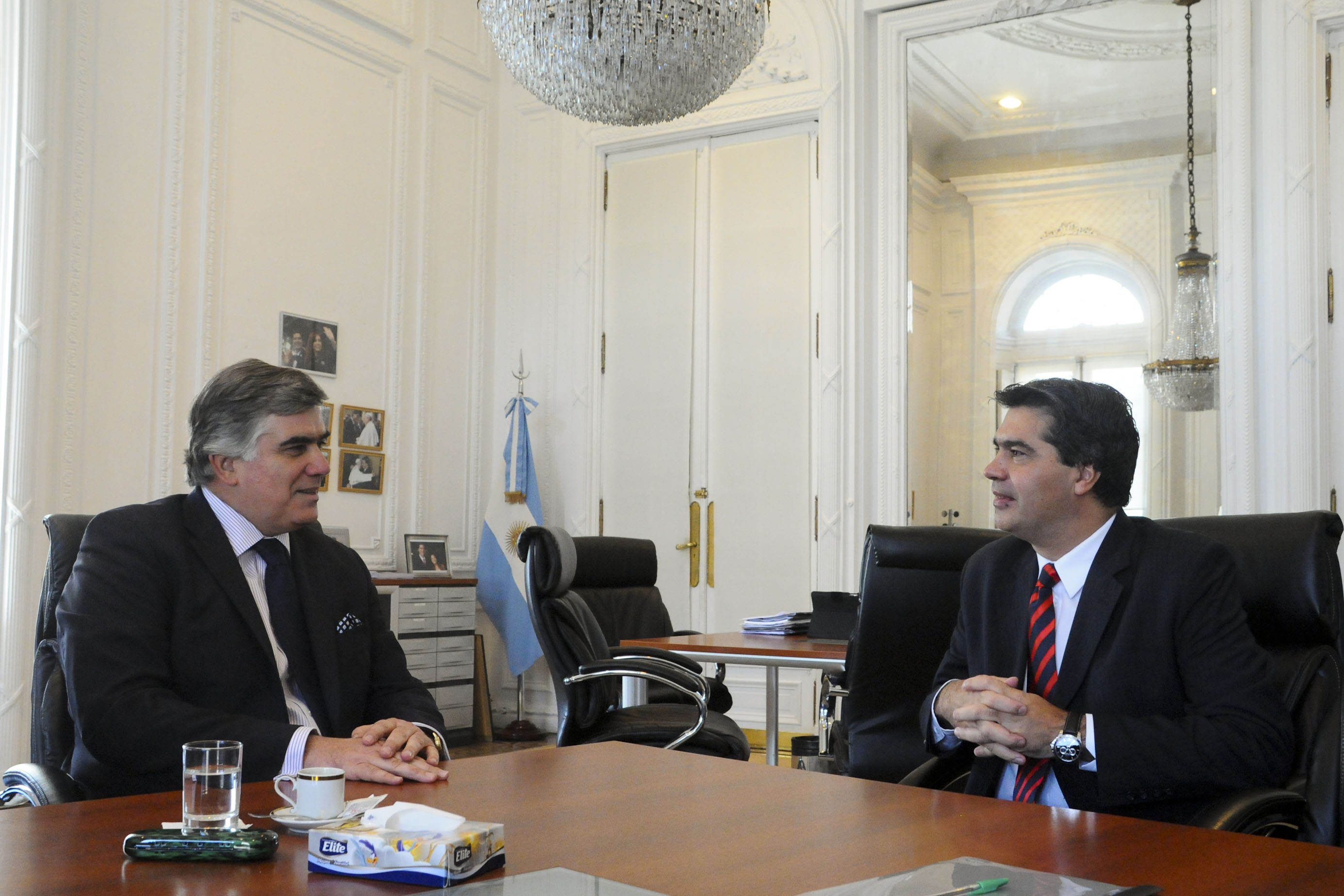 El Jefe de Gabinete argentino, Jorge Capitanich, se reunió, en la Casa Rosada, durante 40 minutos con el Embajador de Chile, Milenko Skoknic; la cita obedeció a una invitación del ministro que quiso explicarle personalmente su visión del momento que vive la Argentina y revisar la agenda bilateral.