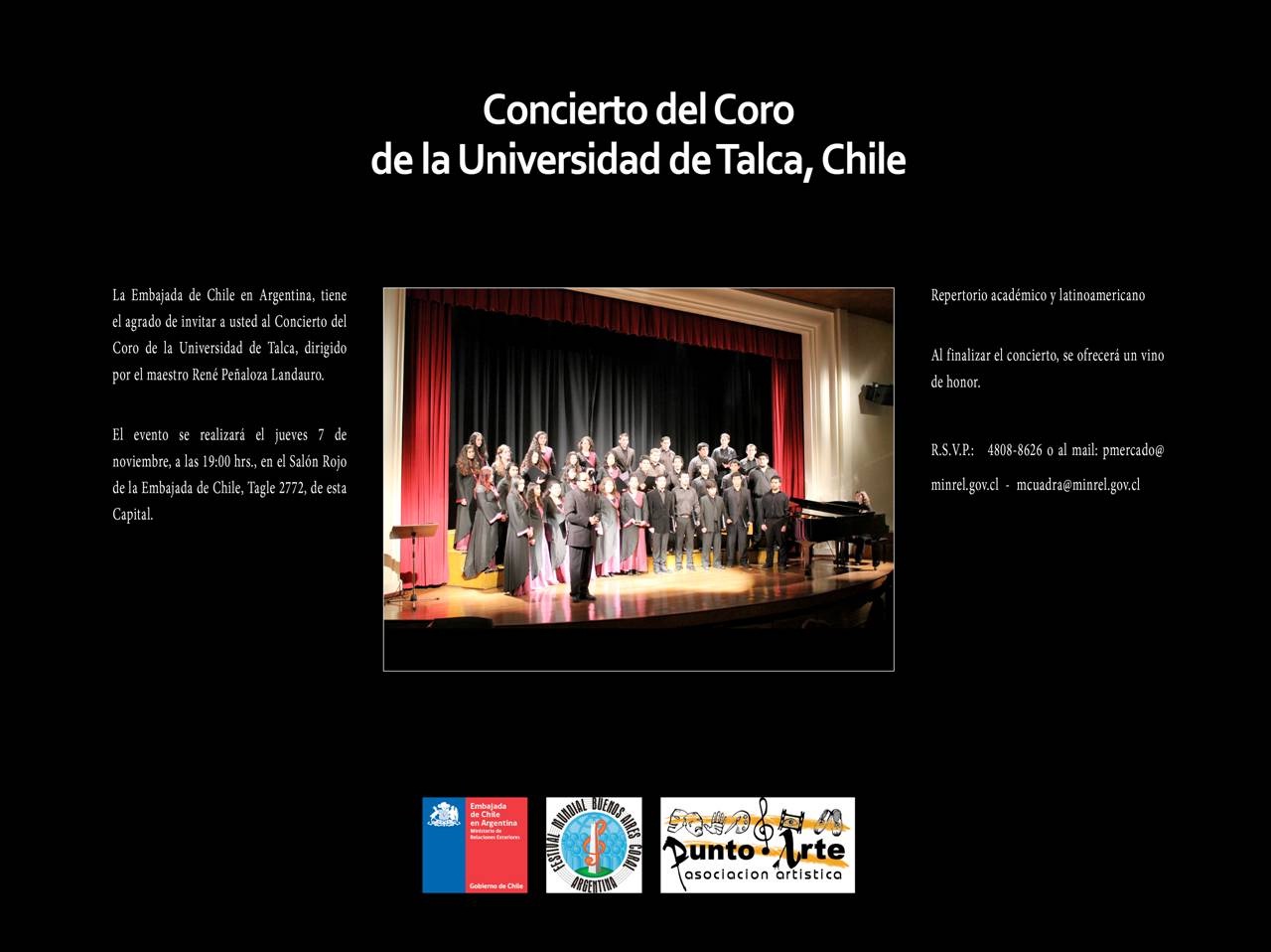 La Embajada de Chile en Argentina invita a todos los chilenos residentes al concierto que realizará el Coro de la Universidad de Talca el próximo 7 de noviembre a las 19:00 hrs en el Salón Rojo de la embajada.