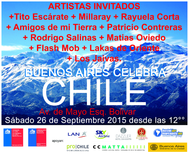 El Consulado General y la Embajada de Chile en Argentina, con el apoyo del Gobierno de la Ciudad de Buenos Aires, organizan el evento Buenos Aires Celebra Chile 2015, a realizarse el sábado 26 de septiembre en Avenida de Mayo y Bolívar, entre las 12:30 y 20:00 hrs. Un evento multitudinario que agrupa cada año a más de 10.000 personas en Plaza de Mayo, en torno a la cultura y tradiciones del país hermano. Shows en vivo, grandes artistas, stands de venta de comida típica, Folclore, artesanías y muestra de productos tradicionales son algunas de las actividades que se podrán disfrutar en ese día.