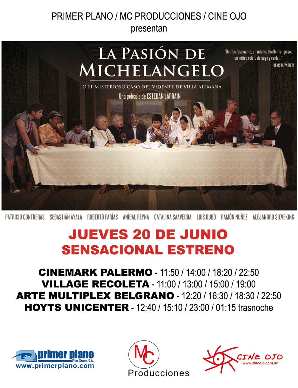 Este jueves 20 de junio se estrenará en salas de cine de Buenos Aires la película chilena La Pasión de Michelangelo del director Esteban Larraín, que contará con la participación de Patricio Contreras, destacado actor nacional residente en Buenos Aires desde 1975. Se invita a la comunidad a disfrutar del gran momento que vive el cine chileno en Argentina.