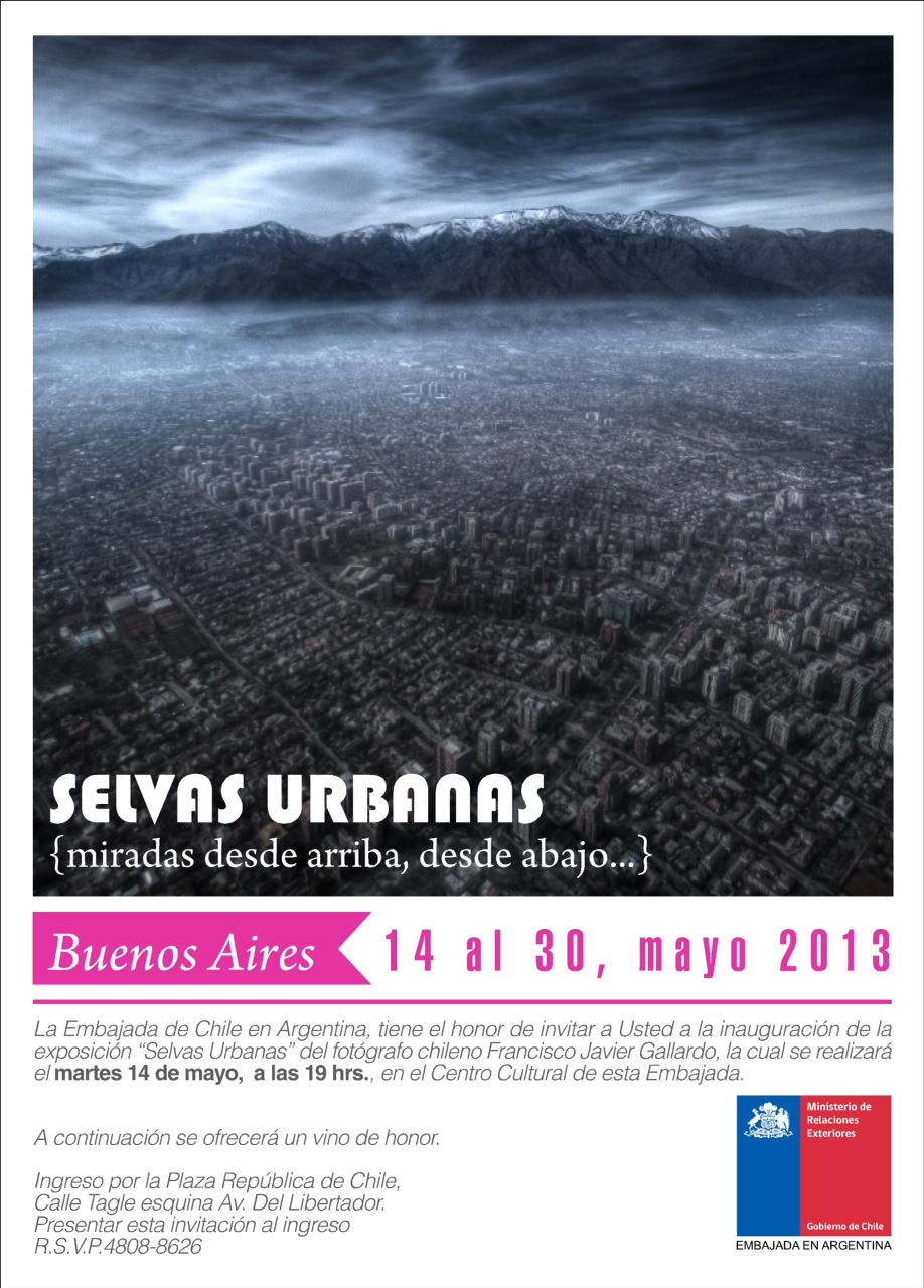 La Embajada de Chile en Argentina los invita a la inauguración de la exposición "Selvas Urbanas" del fotógrafo chileno Francisco Javier Gallardo, que se llevará a cabo en el Centro Cultural de la Embajada de Chile, el día martes 14 de mayo, a las 19 hrs.