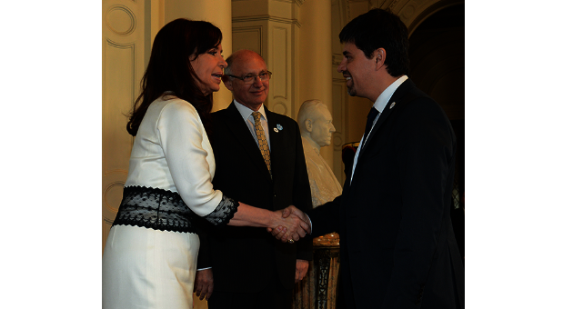 En la foto el embajador Marcelo Diaz saluda a la presidenta Cristina Fernández de Kirchner por el aniversario patrio, junto a ella el Canciller Héctor Timerman.