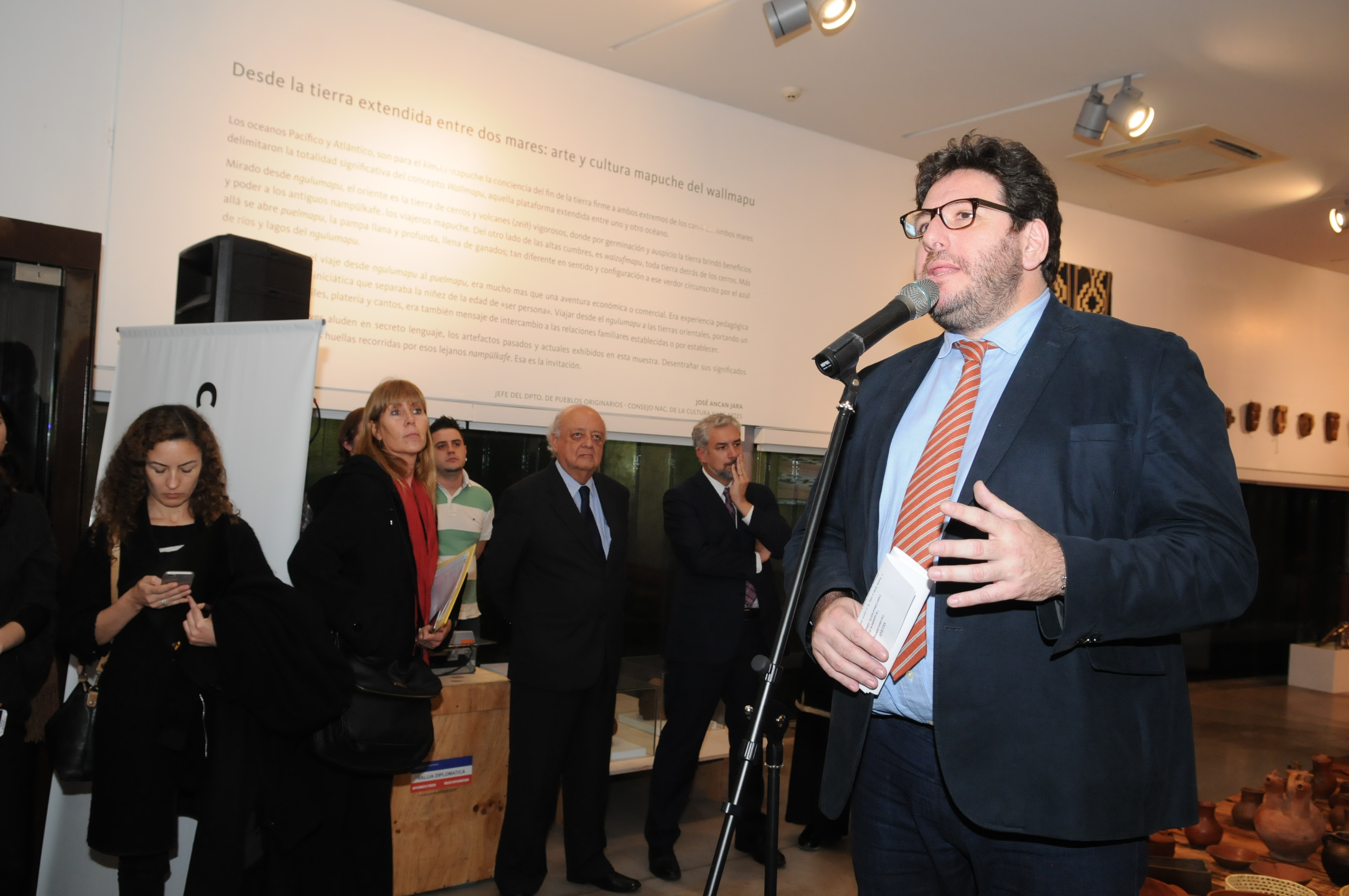 La ceremonia contó con palabras del Ministro de Cultura de Argentina Pablo Avelluto quien agradeció a las instituciones que permitieron concretar la exhibición y del Ministro de Cultura de Chile, Ernesto Ottone, quien destacó, estamos ante una exposición que es al mismo tiempo una experiencia estética conmovedora y un gesto que restituye simbólicamente parte importante de una cultura prehispánica. Y lo hace a través de las piezas más significativas del arte mapuche, un pueblo que habita un territorio demarcado por la extensión de su propia cultura, más allá de las fronteras entre Chile y Argentina.