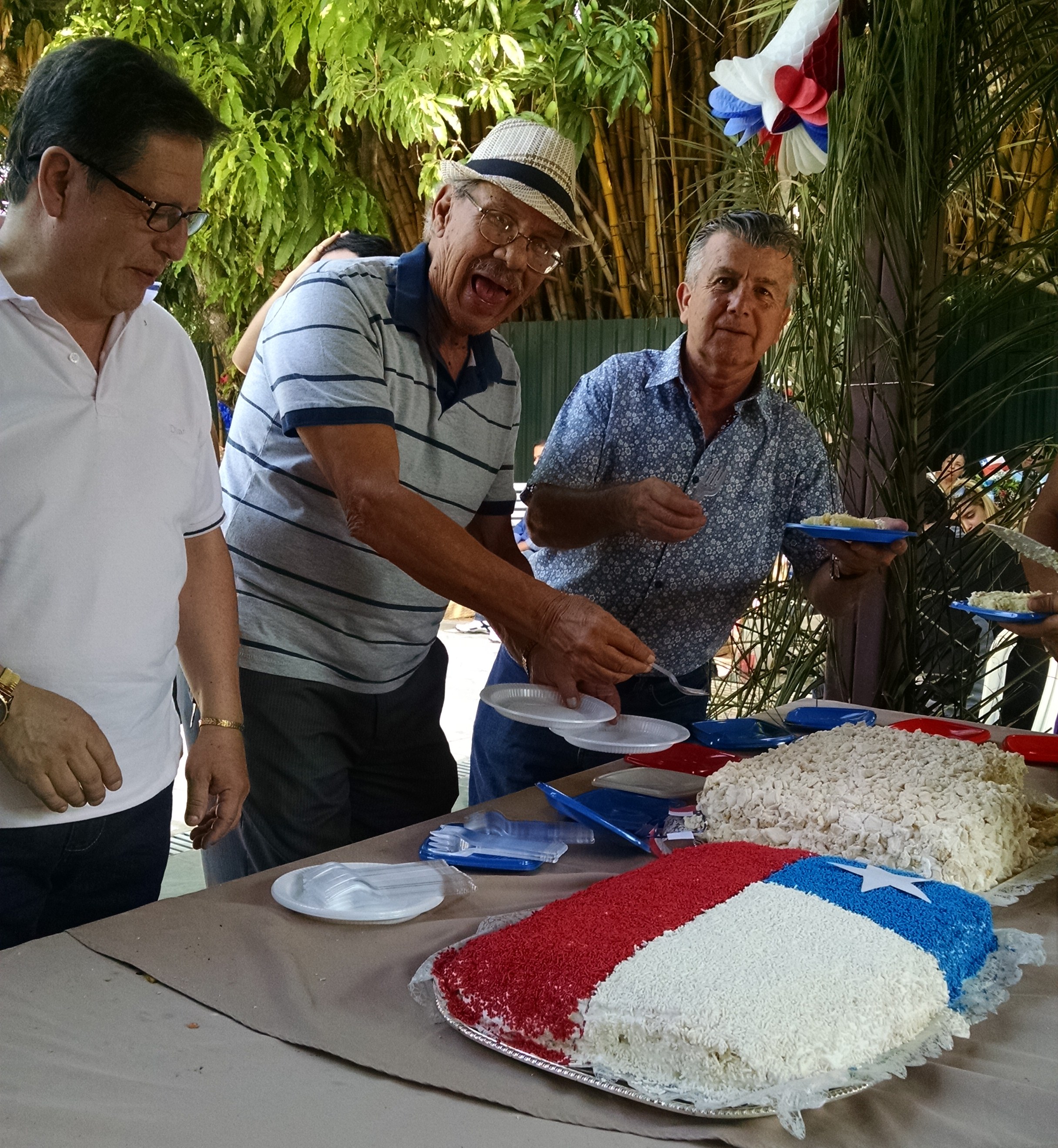 Los asistentes a la fiesta, que se desarrolló en los jardines de la Embajada, pudieron degustar empanadas de horno, choripanes y asado, acompañados por ricas ensaladas, pisco sour, vino, ponche, cerveza y tortas decoradas con motivos chilenos.