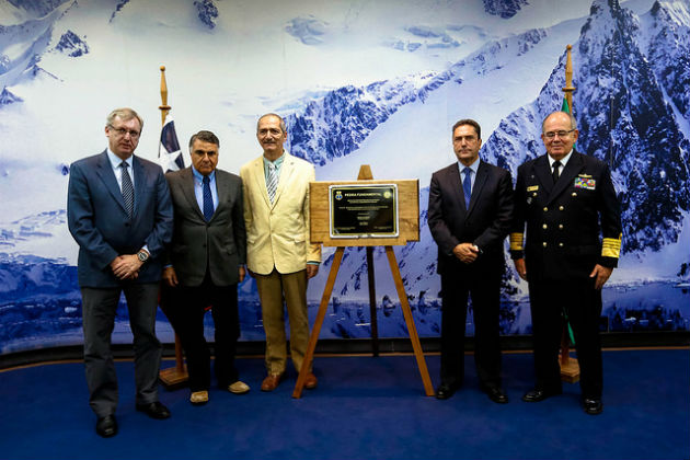 El Ministro de Relaciones Exteriores (S), Edgardo Riveros, junto al Ministro de Defensa Nacional, José Antonio Gómez, y su par de Brasil, Aldo Rebelo, participaron en la ceremonia simbólica de colocación de la Primera Piedra de la Estación Antártica de Brasil, "Comandante Ferráz", que fue destruida en un incendio ocurrido el año 2012.