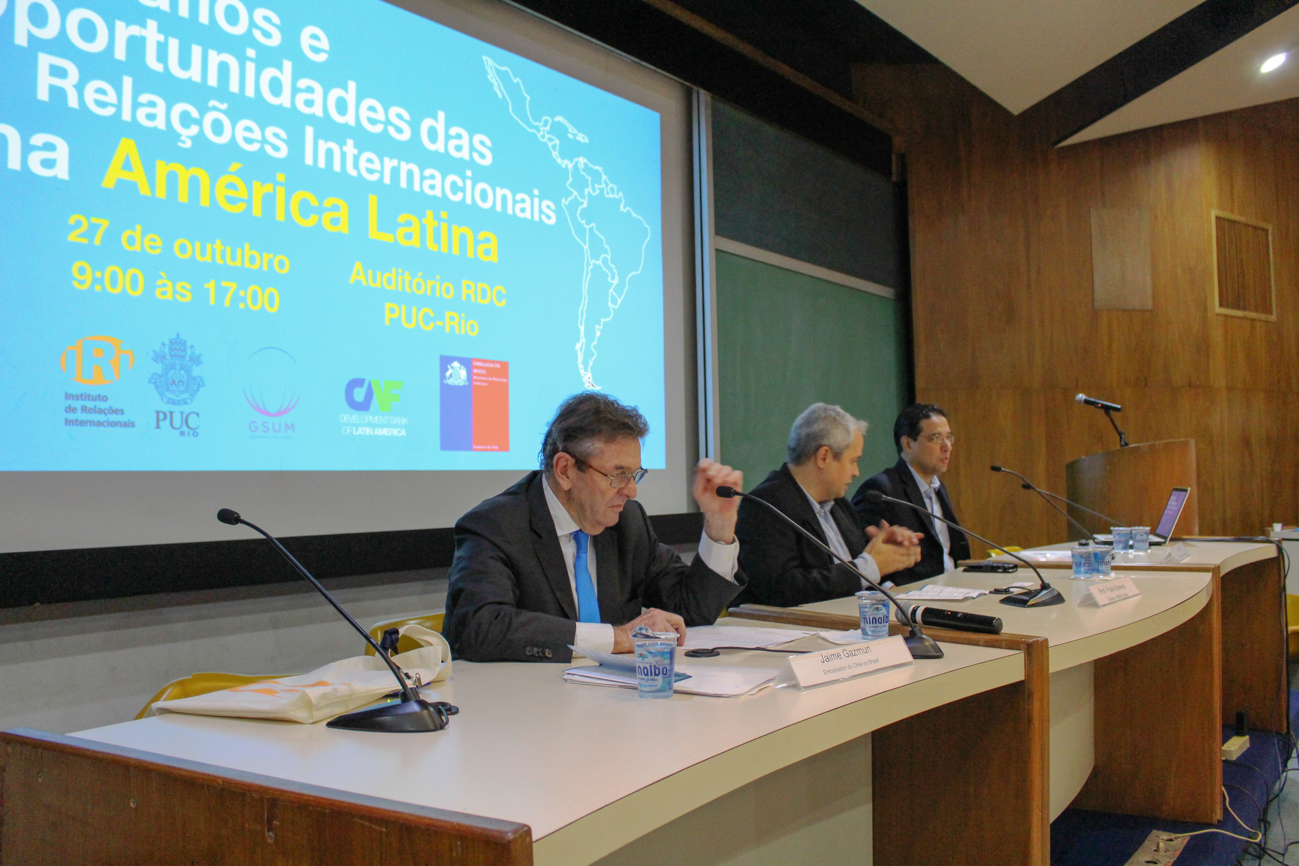 El pasado 27 de octubre se llevó a cabo en el prestigioso Instituto de Relações Internacionais (IRI/PUC-Rio) el Seminario: "Desafíos y Oportunidades de la Relaciones Internacionales en América Latina", organizado conjuntamente entre la Embajada de Chile en Brasil y la Pontifícia Universidade Católica do Rio de Janeiro (PUC-Rio), con el apoyo del Banco de Desarrollo de América Latina (CAF).