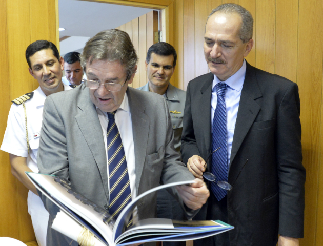 El Embajador Jaime Gazmuri hojea un libro, en compañía del Ministro de Defensa de Brasil, Sr. Aldo Rebelo. Atrás, a la izquierda en la fotografía, el Agregado Naval y de Defensa de Chile en Brasil, capitán de Mar y Guerra Alberto Osorio.