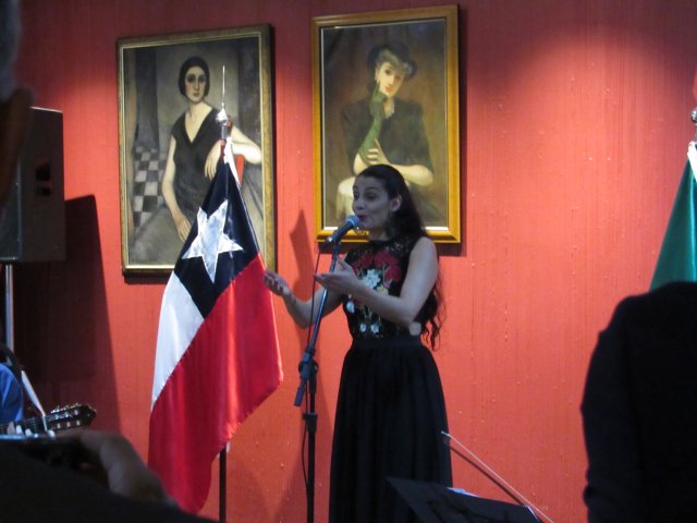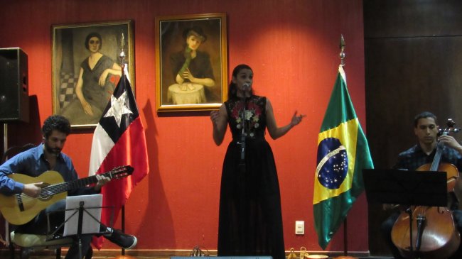 La cantante brasileña Fernanda Cabral, acompañada de su grupo, fue invitada por la Embajada para interpretar algunas de las más afamadas canciones de Violeta Parra, lo que marcó uno de los momentos de mayor emotividad de la noche.