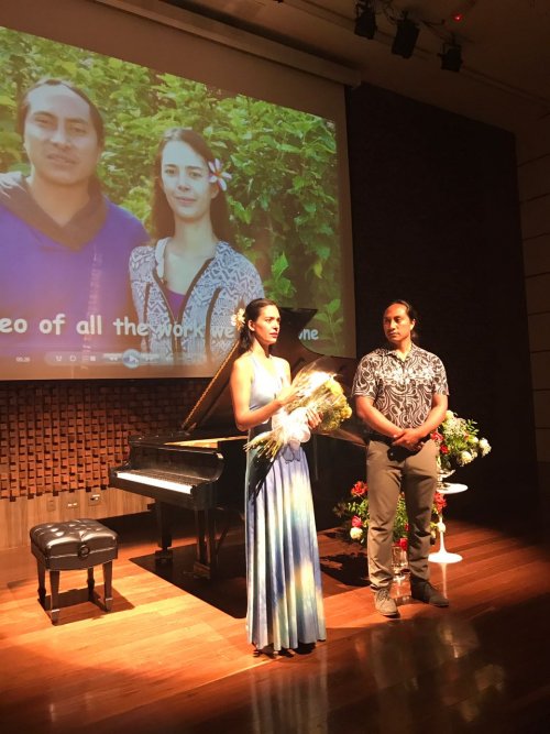 Cerrado el concierto, ambos se refirieron al relevante emprendimiento que impulsan en Pascua de una Escuela de Música para niños, bajo el paraguas de la ONG Toki, que ha recibido apoyo desde diversas partes del mundo. Para ello, construyeron un recinto totalmente autosustentable y para cuya erección se emplearon materiales reciclables como neumáticos y botellas, en una clara medida de protección del medio ambiente de la isla.