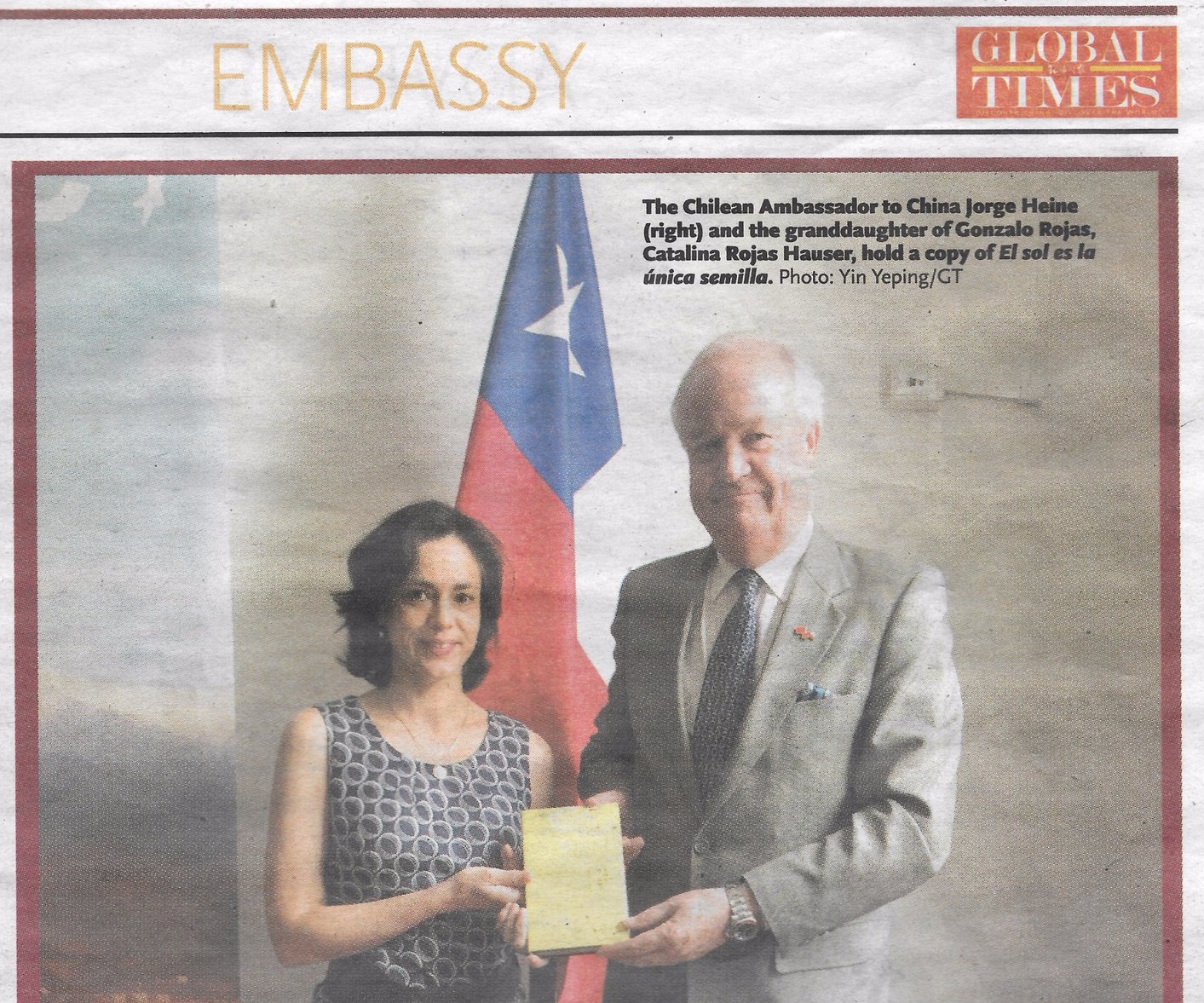 Un acto lleno de elementos simbólicos fue el lanzamiento de la edición de la antología poética en chino mandarín de Gonzalo Rojas, titulada El sol es la única semilla, que realizó la Embajada de Chile en China el pasado 28 de julio. Esta obra con 88 poemas e ilustraciones del pintor Roberto Matta, fue publicada por la editorial The Commercial Press, una de las principales editoriales de China, en una edición de 228 páginas, y un tiraje de 3.000 ejemplares.