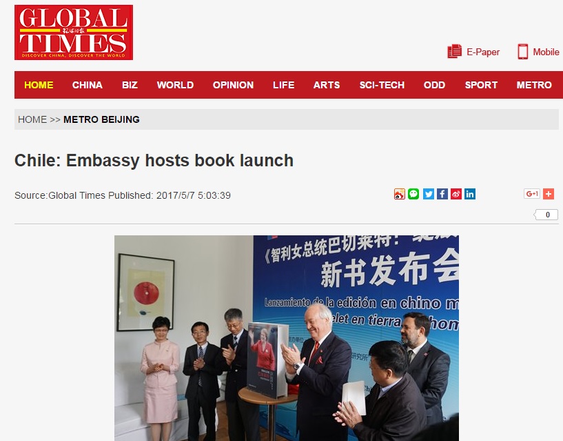 El periódico Global Times, que circula en toda China en idioma inglés, publicó en una nota destacada el lanzamiento de la edición en chino del libro Bachelet en tierra de hombres, escrito por la periodista chilena Patricia Politzer, actividad que se efectuó en la Embajada de Chile en China el 3 de mayo pasado.