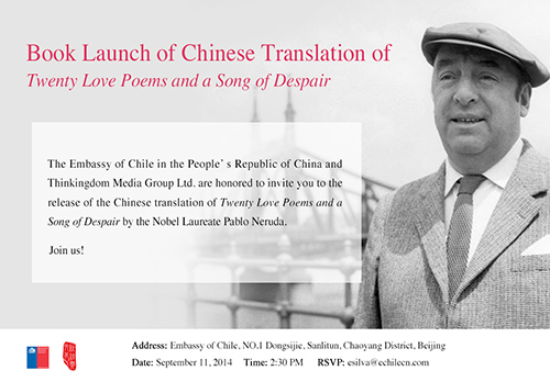 El 11 de septiembre tuvo lugar en la Embajada de Chile en China el lanzamiento de una nueva edición en chino de la poesía lírica de Pablo Neruda. Publicada por la editorial Think Kingdom, en una tirada de 100,000 ejemplares, el libro incluye Veinte poemas de amor y una canción desesperada, Los versos del capitán y Cien sonetos de amor. Obra del prominente traductor Chen Li, la cuidada edición fue presentada por el Embajador Jorge Heine, quien aludió a la vida y obra del vate y a su larga relación con China. Ello fue seguido por un coloquio entre catedráticos universitarios y críticos literarios chinos que comentaron la obra más íntima del poeta nacional. El evento recibió amplia cobertura de medios tanto en China como en Chile, cuyos enlaces están a continuación: