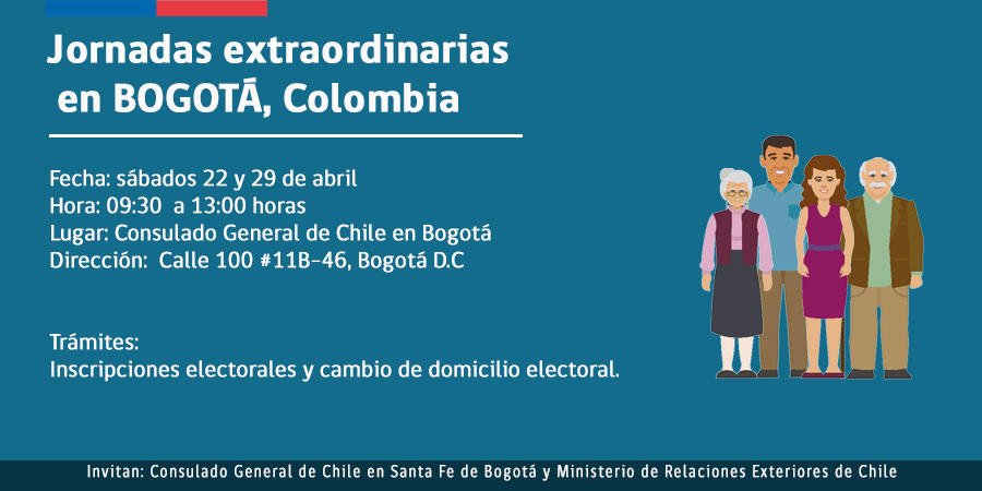 El Consulado General de Chile en Bogotá abrirá sus puertas en una jornada extraordinaria los sábados 22 y 29 de abril, de 9:30 a 13:00 horas.