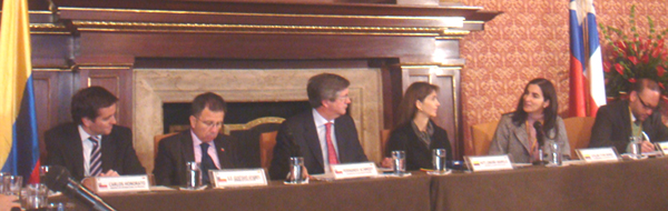 El Subsecretario Fernando Schmidt inauguró en el Palacio de San Carlos, sede del Ministerio de RR.EE. de Colombia, el taller Experiencia de Chile en la OCDE y su inserción en Asia Pacífico. El citado curso fue organizado por las cancillerías de ambos países y contó con las intervenciones del Subdirector Internacional de Prochile, Carlos Honorato, y de representantes de la Dirección de Relaciones Económicas Internacionales (Direcon) y del Ministerio del Medio Ambiente de Chile.
