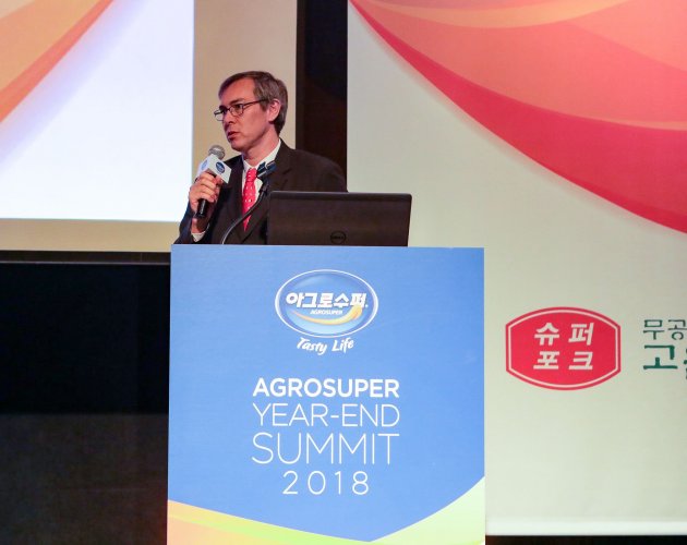 El Sr. Takamiya se dirigió al público y ofreció un saludo conmemorativo a los invitados e importadores locales, realizando un balance de los principales eventos que caracterizaron el año 2018. Asimismo, se efectuaron proyecciones de las tendencias de consumo para el año 2019, resaltando la rigurosidad con la que Agrosuper desarrolla cada uno de sus procesos y la importancia de seguir fomentando los lazos de colaboración y confianza entre los diversos actores involucrados en la cadena de producción y distribución de los productos de esa empresa en Corea.