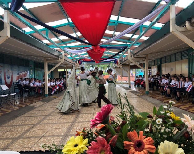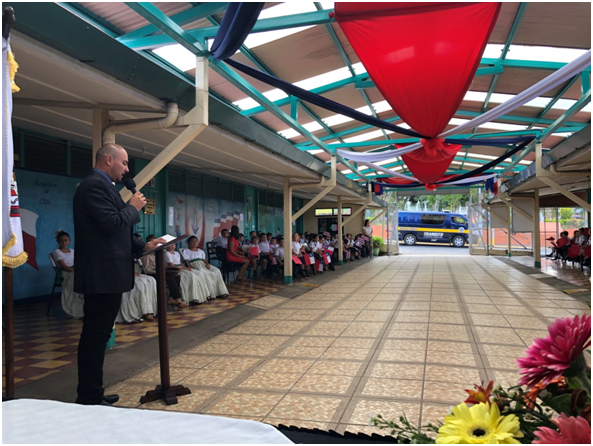 La Escuela organizó un acto oficial de bienvenida que incluyó un desfile de las banderas, himnos nacionales de Costa Rica y Chile, himno del colegio, interpretación de canciones y bailes folclóricos por alumnos, finalizando con discursos del Director y del Embajador Alcaman.
